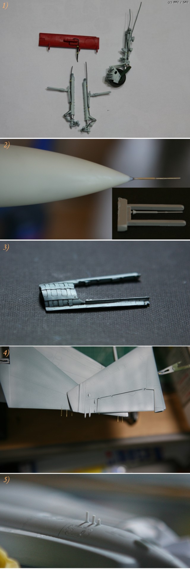 5) 소련기에 독특하게 붙어있는 전 삼지창?이 뒷부분인 엔진 노즐 부분에는 생략되어있어서 저리 핀바이스로 구멍뚫고 프라봉을 넣어주었구요 ...노즈콘 부분의 저 삼지창은 아카데미 설명서와 실기 사진이 반대로 되어있어서 수정했습니다..