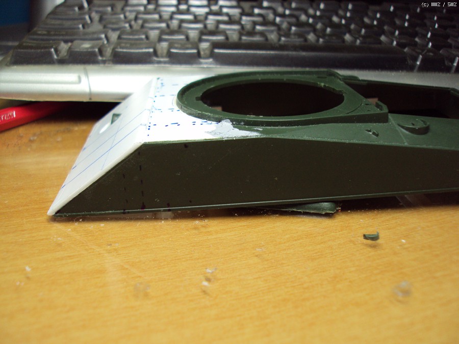 포탑 뒤쪽의 각도가 다르고 포수 해치가 없어야 하므로 역시 잘라낼 것은 잘라내고 덮어 줄 거은 퍼티로 말끔히 덮어 줬습니다.