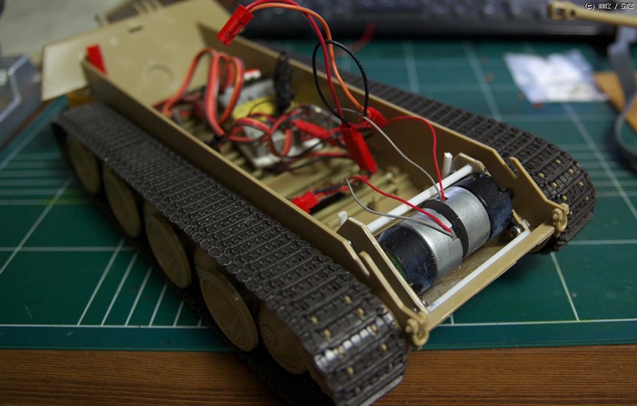 구동 유닛 부분 입니다. 아카데미 구판 1/25 야크트 판터는 기어박스가 들어있다고 하던데 절판되어서 구할 방법이 없습니다. 별수 없이 자작 기어박스를 만들어서 꾸며 봤습니다. 재료는 기어드 모터 2개 + 10T 피니언 기어 2개, 2mm 플라판, 3mm 플라봉, 볼트 너트 다수 입니다. 추후 계속 진행 하면서 모터 속도 조절은 BA6208이라는 DC 모터 구동 IC와 AVR을 이용해서 조절 해 줄까 합니다. 일단 현재까지는 ESC 2개 이용 중. ^^;
