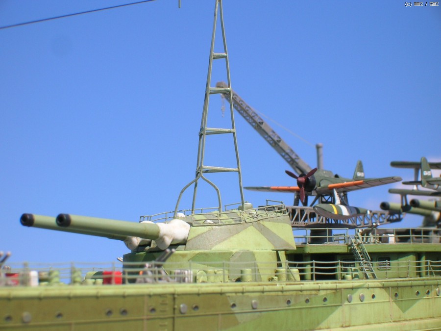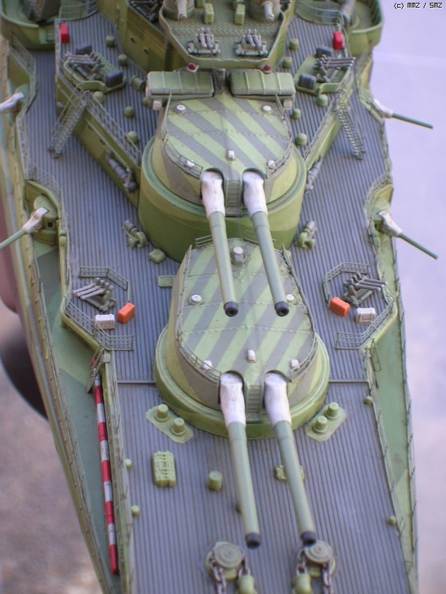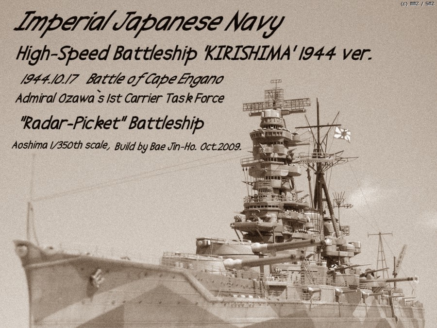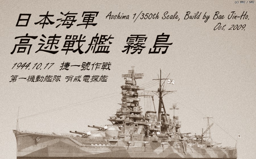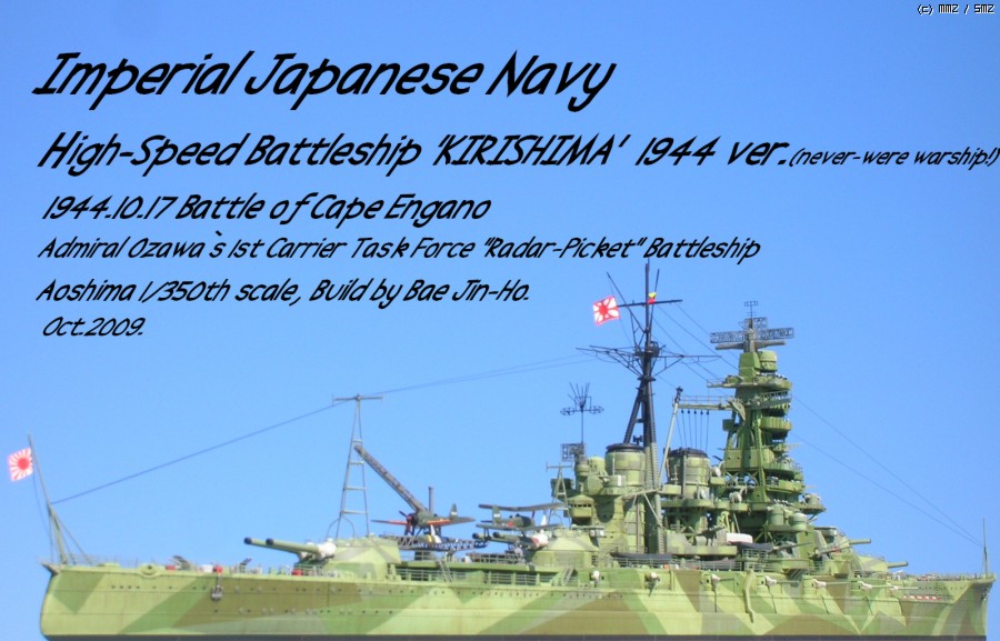 벌써 지난 달 전부터 떠들어서(;;) 새로울게 하나도 없는 이 괴작(?)에 대한 간단한 부연 설명이라면 일단 철저한 가상함입니다. 실제 역사에선 1942년 11월의 제 3차 솔로몬 해전에서 대파당한 후 자침 처분된 일본해군의 공고급 고속전함 기리시마(아오시마 1/350 키트를 사용)인데 만약 이때 자침 처분되지 않고 회항했다면(;;;) 이라는 설정으로 만들어본 전함입니다.