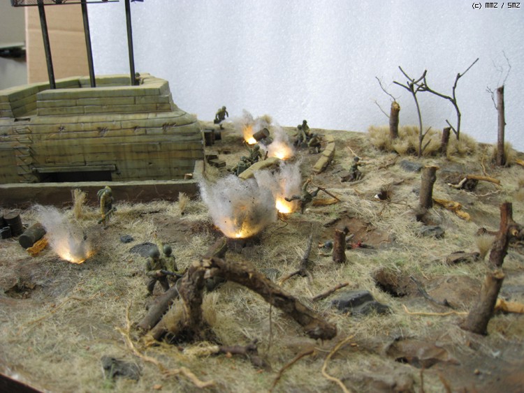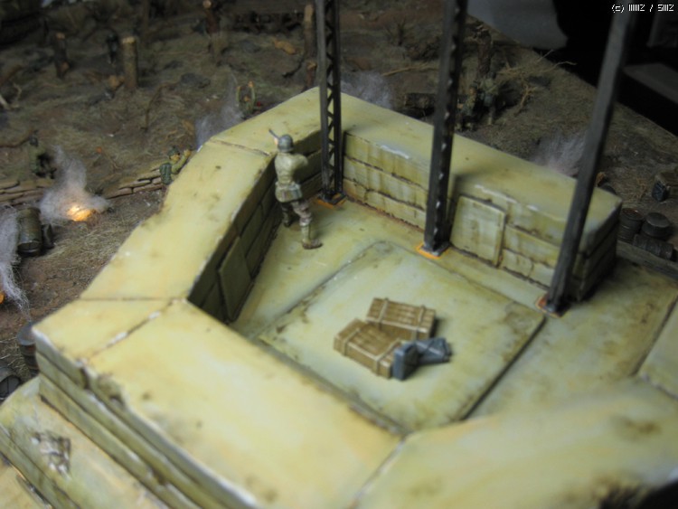 폭탄이 피폭되는 장면을 연출해 볼려구 지면밑에 LED(간판용)를 심어봤습니다..노력에 비해 좀 허탈하네요..^^;; 벙커는 이탈레리제구요..안테나는 프라봉이랑 건축모형용 트러스, 금속메쉬로자작해 봤습니다..역시 게임처럼 파괴된 형태로...