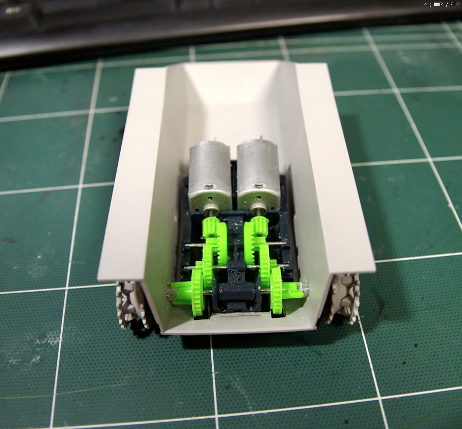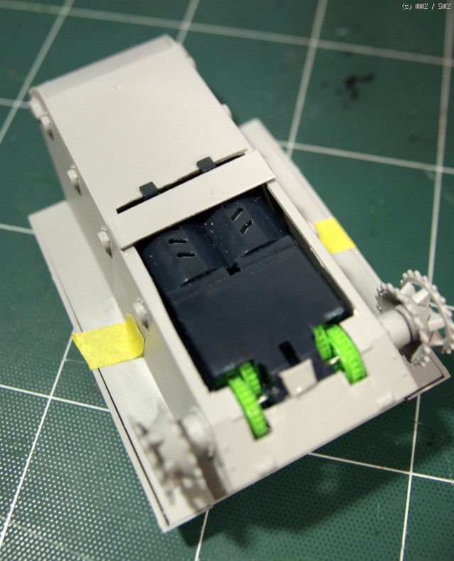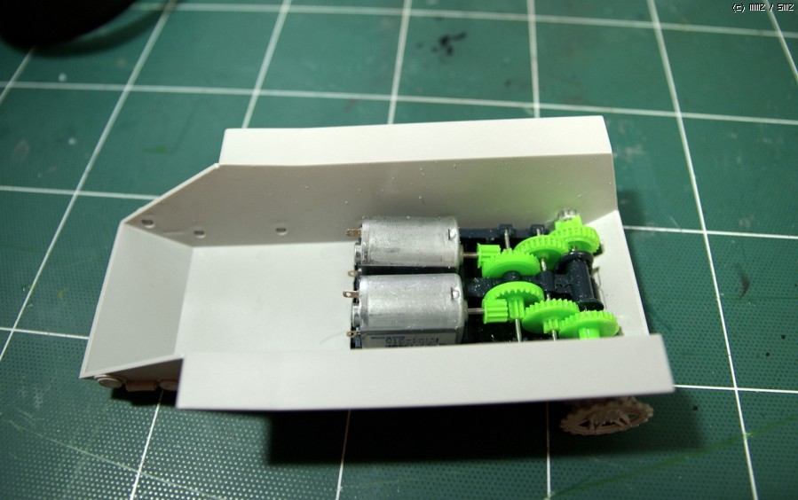 E-10에 들어간 기어박스는 아카데미 1/48 모터라이즈 전차류에 있는 기어박스 입니다. 그대로 사용하기는 어렵고 기존 모터 교환 및 기어박스 손질이 필요합니다. (기존 모터의 출력이 약해서 그대로 사용하면 바로 타 버립니다) 그리고 기어박스가 그대로 안 들어가기 때문에 E-10의 배를 아트나이프로 잔인하게 난도질해서 구멍을 내 주었습니다 ^^;; 나중에 저 부분은 얇은 플라판으로 땜빵을 해 줄까 합니다. 어차피 설계도면에만 있던 전차니 "대용량 엔진을 탑재하는 바람에 설계도면과는 다르게 야전 개조 되었다" 라고 우기면 그만이겠군요. ㅎㅎㅎ