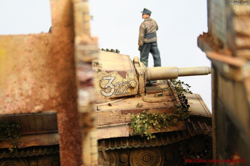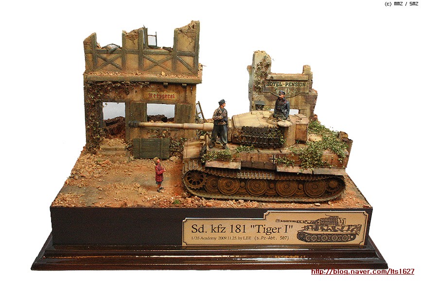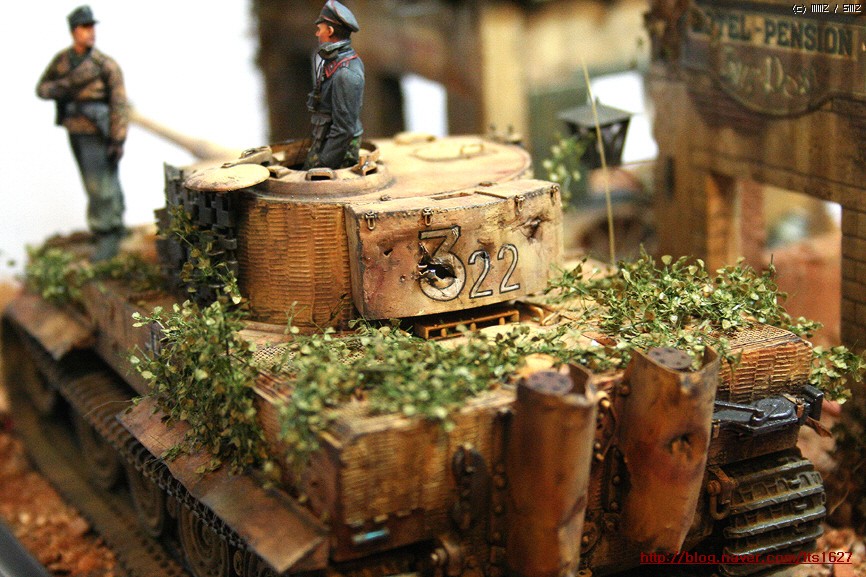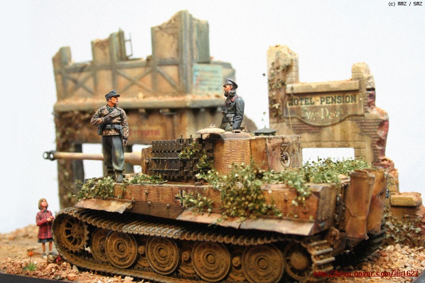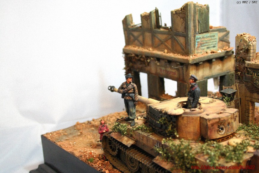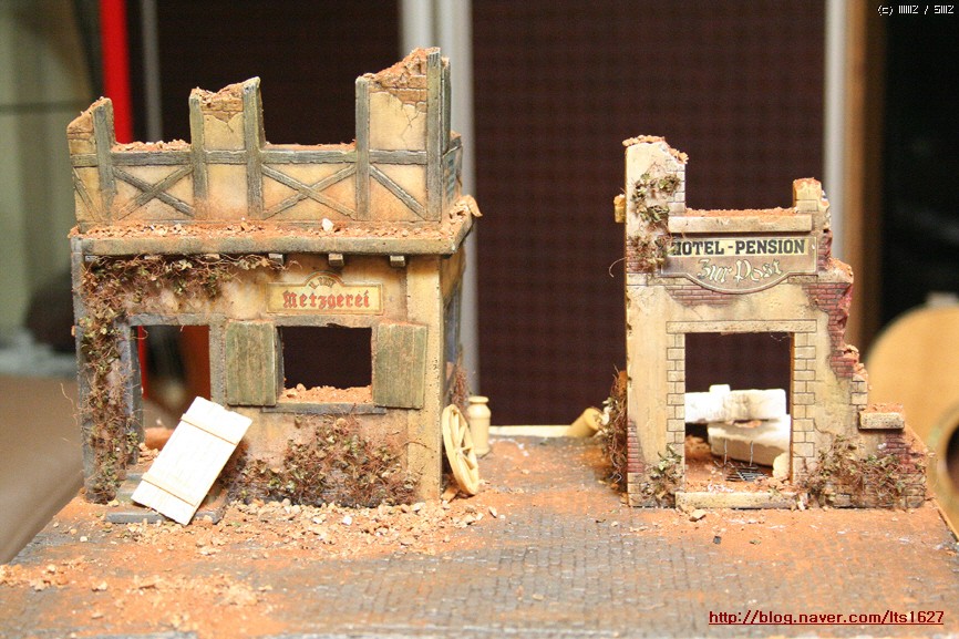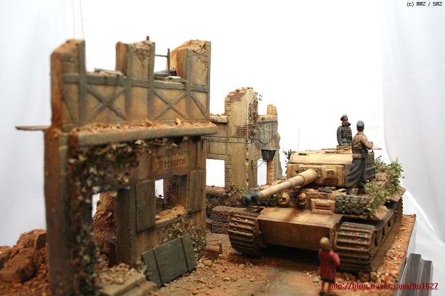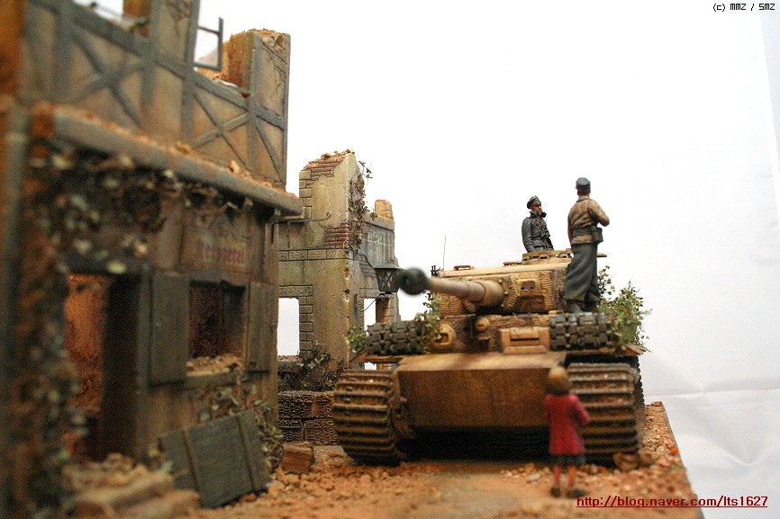 전체적으로,,아카데미 제품으로 티이거 후기형,소프트비닐 건물(왼쪽) . 오른쪽 건물은 이탈레리 제품입니다.