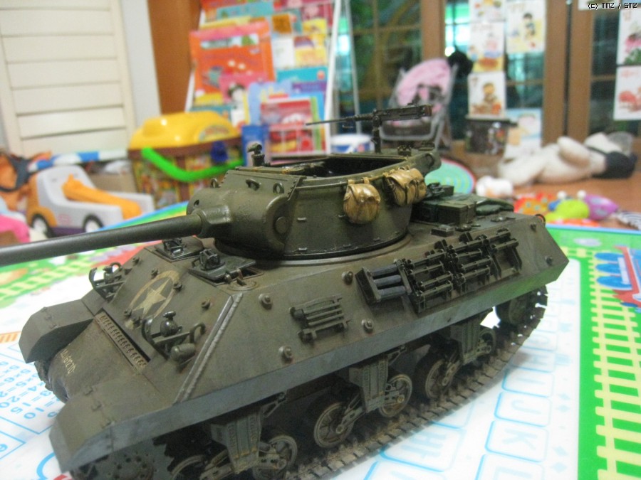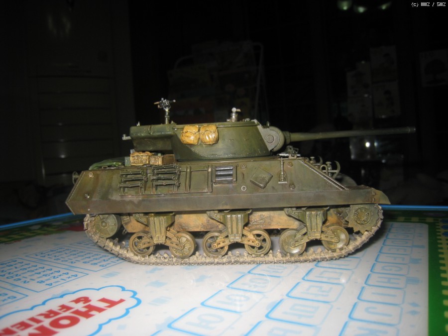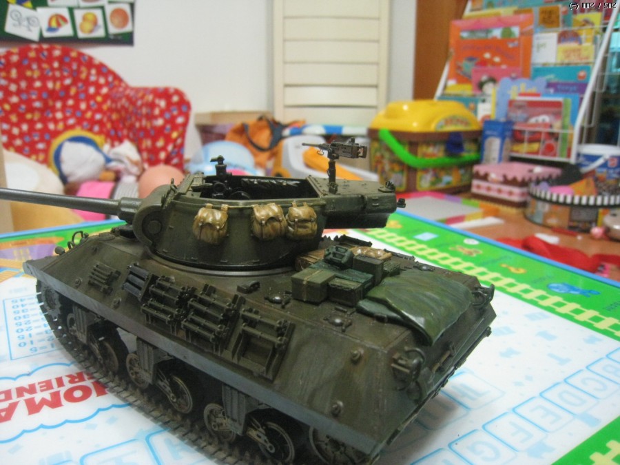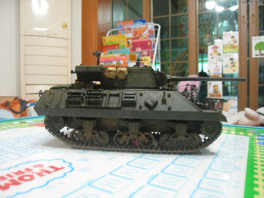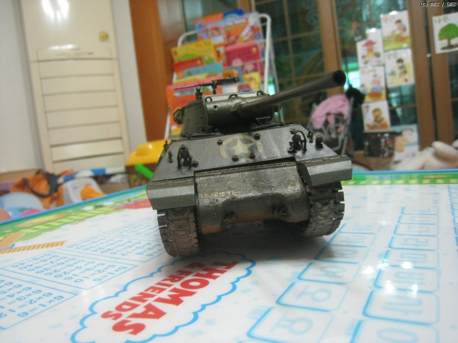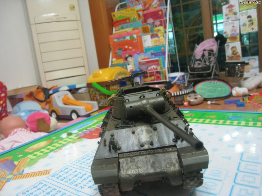 아직 디테일 색칠과 기관총 부품과 탄띠를 못칠했네요.캐터필러는 키트에 들어있는 민무늬 셔먼캐터필러 아카데미것을 끼웠더니 폭이 좁아서 그런지 어색해서 점보 셔먼에 끼어놓았던것을 벗겨서 일단 사진만 찍었습니다.