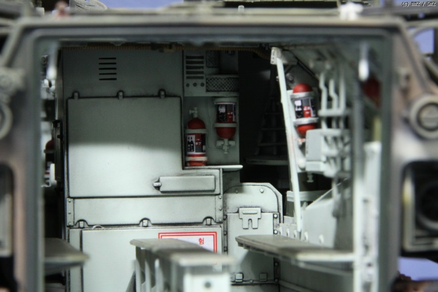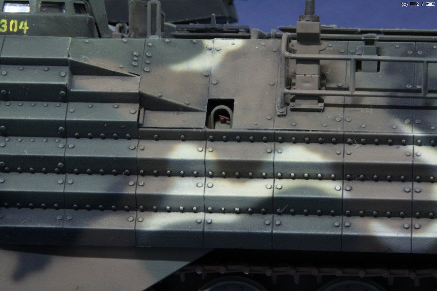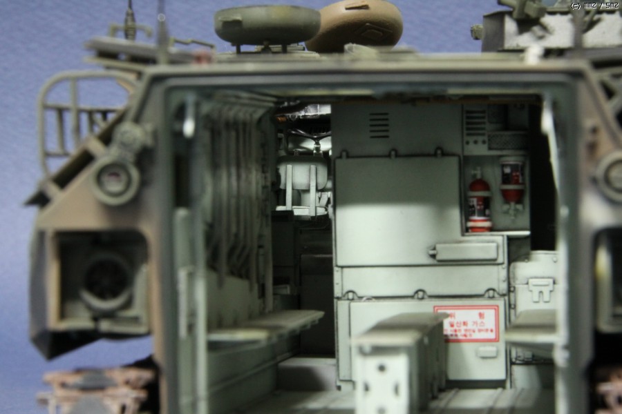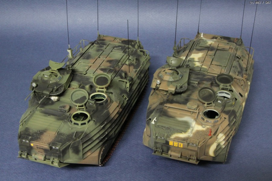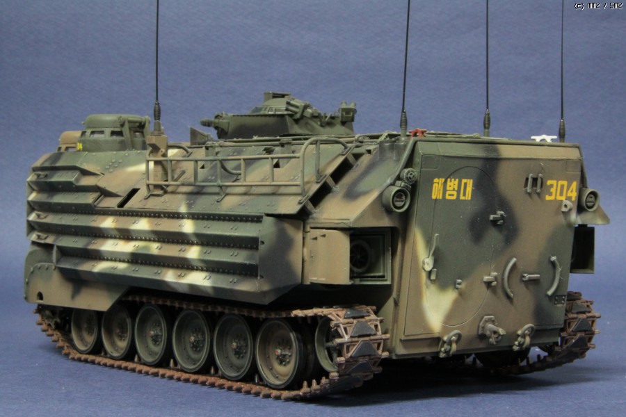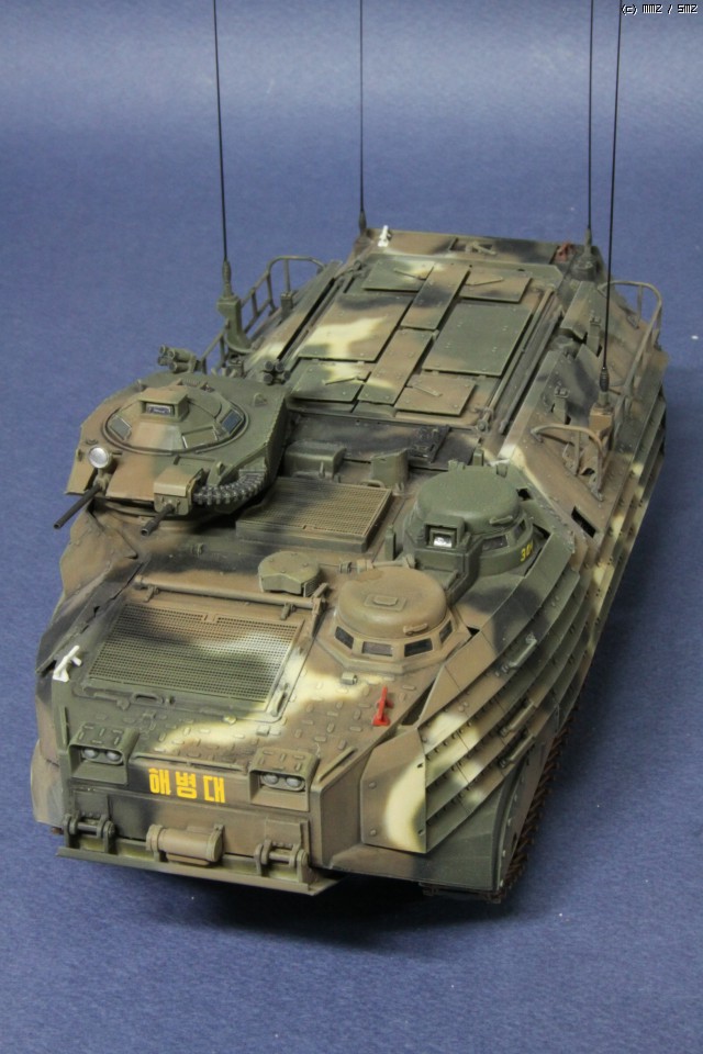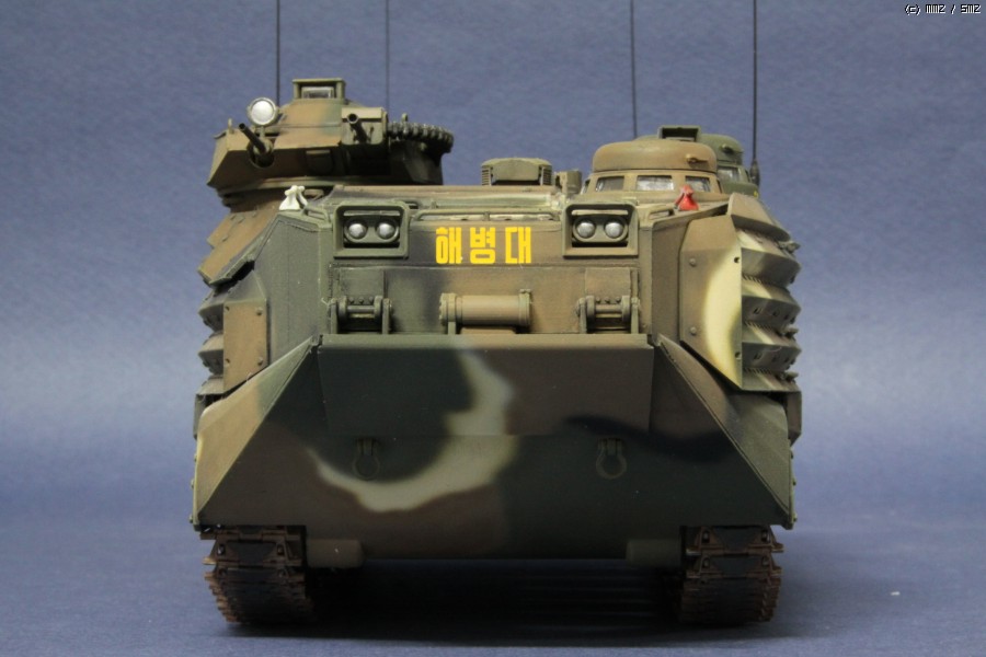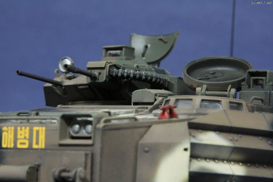 전작 미해병대버전과 주요 차이점이자 디테일업 포인트는 예비캐터필러의 위치이동(차량측면후부→상부전면), 수기용 깃발꽂이 부착(큐폴라후면), 해치 내외부 손잡이, 외부 화재진압레버, 우측 1번 어플리케(증가장갑)결속 브라켓/볼트 재현 등 이며 투명 관측창은 30% 미러 선팅지를 이용 틴팅해 주었고 캐터필러는 킷의것을 사용하였습니다. 개인적으로 명예를 걸고 제작한 두꺼비 입니다...^^