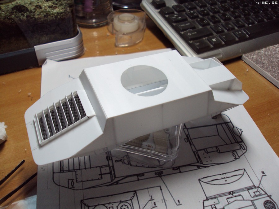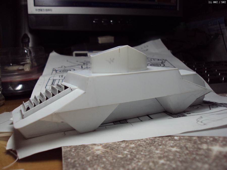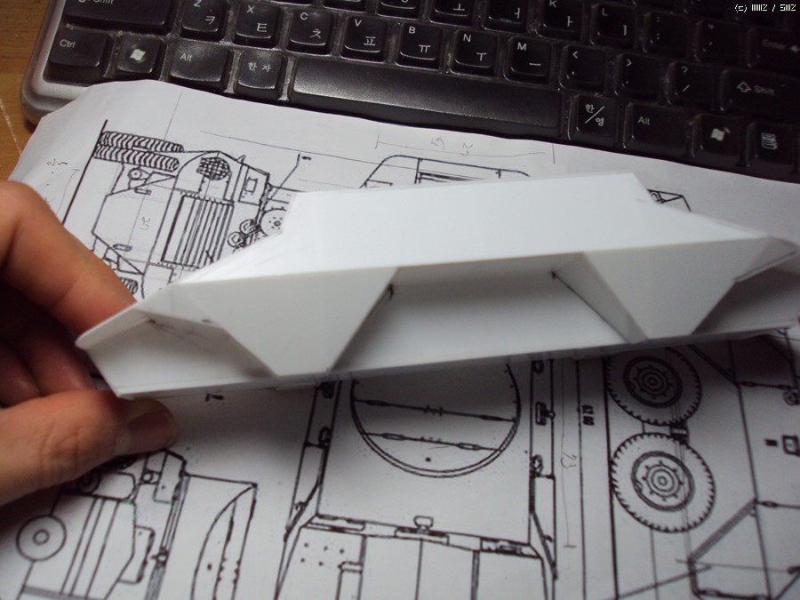 역시 장갑을 덧입혀 줍니다. 그런데 이렇게 모양이 오묘한 녀석은 측면장갑을 먼저 올려줄지, 상판 장갑을 먼저 올려줄지 한참을 고민해야 합니다. 결국 모양잡기가 쉬운상판을 먼저 올려줬습니다. 그리고 0.3mm 플라판을 측면전체에 둘러 대략의 본을 뜨고 잘라내준 뒤. 튼튼히 접착후 삐져 나온 부분을 다듬어줬습니다. (그렇지 않으면 그 반대로 측면장갑을 먼저 붙이고 상판을 올린 후 삐져 나온 상판을 다듬어 줘야 합니다.)