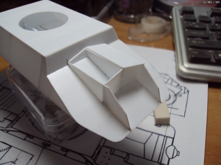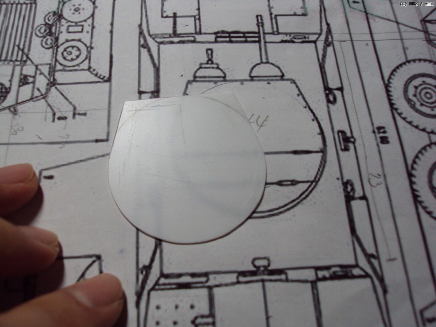 이제는 포탑을 만들 차례. 도면의 사이즈에 맞는 원형자를 이용하여 철필로 윤곽을 그려준 후 칼을 이용해서 조심스레 잘라냈습니다. 사진은 제대로 나왔는지 확인을 위한 작업 중...