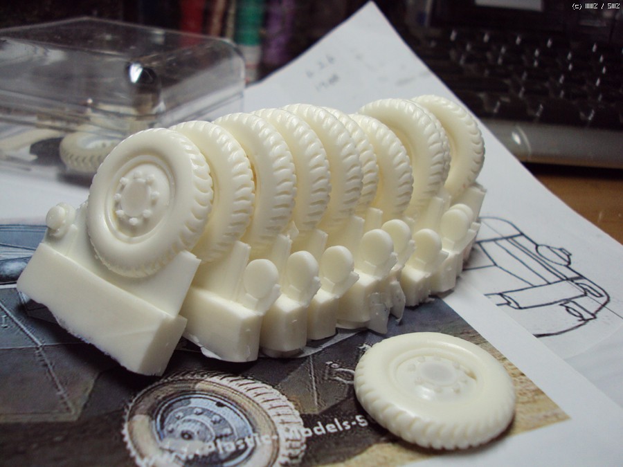 이제 위의 작업을 단순 반복 하면 이렇게 대량의 휠이 복제됩니다. 그러나... 사진으로는 확인이 안되지만 연질의 실리콘 틀을 이용하기에 시간이 지날수록 몰드가 찢겨지고 경화시의 열로 수축되어서 후반에 작업한 두개의 경우는 가운데 구멍이 생길 정도로 변형이 되었습니다. 움... 이런 녀석은 안보이는 안쪽 바퀴로 넣을 계획입니다. 제가 제작하는 녀석의 휠이 무려 12개나 되다보니 이렇게 많이 만들어도 겨우 수량을 채울 수 있었습니다.