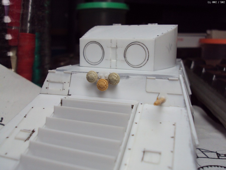 다음으로 포탑 정면에 달아줘야 할 기관포를 위한 포방패 제작. 에폭시를 조형해서 해줄까 생각도 했지만 경화와 다듬기가 귀찮아서 플라판을 이용하기로 결정했습니다. 먼저 원하는 사이즈보다 약간 작은 쇠구슬을 움직이지 않게 자의 구멍 위에 놓고, 불로 가열한 플라판을 위에 눌러주고 정확한 각을 살려주기 위해 더불어 원형자로 마저 눌러주면 깔끔하게 반원형의 포방패가 완성됩니다. 세개의 반원 중 12시 방향의 것은 자로 눌러주지 않은 것입니다. 차이를 비교해보시길...