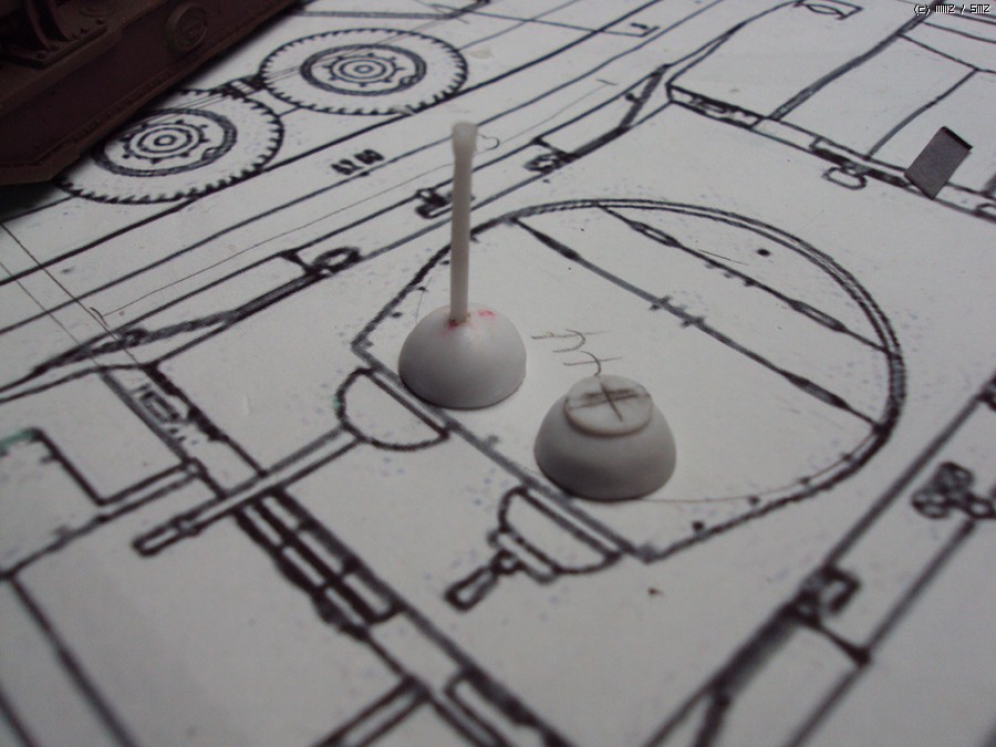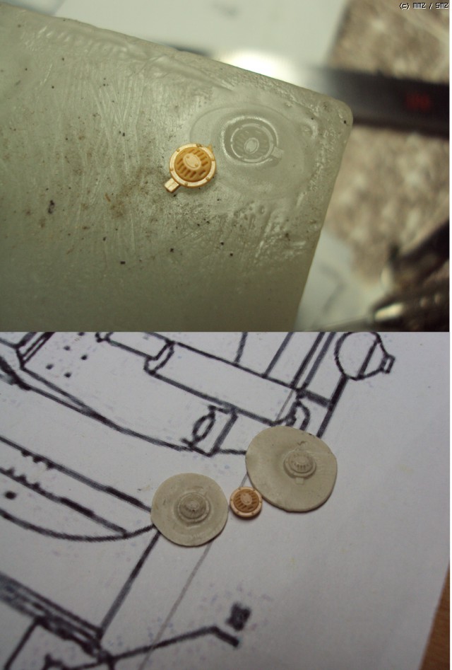 이번엔 경음기의 간단한 복제. 원형으로 타미야의 4호전차 장비품 세트의 것을 사용했는데 이것 하나를 복제하자고 끈적이는 실리콘을 사용할 수는 없어서 파라핀 덩어리를 가열해서 녹인 후 반정도 응고된 상태에서 꾹 눌러줘서 틀을 만들었습니다. 여기에는 우레탄 보다는 에폭시 퍼티를 꾹 눌러서 복제해줬습니다.