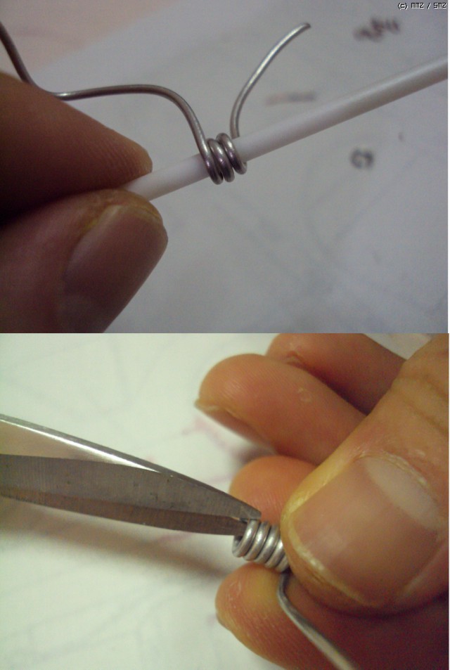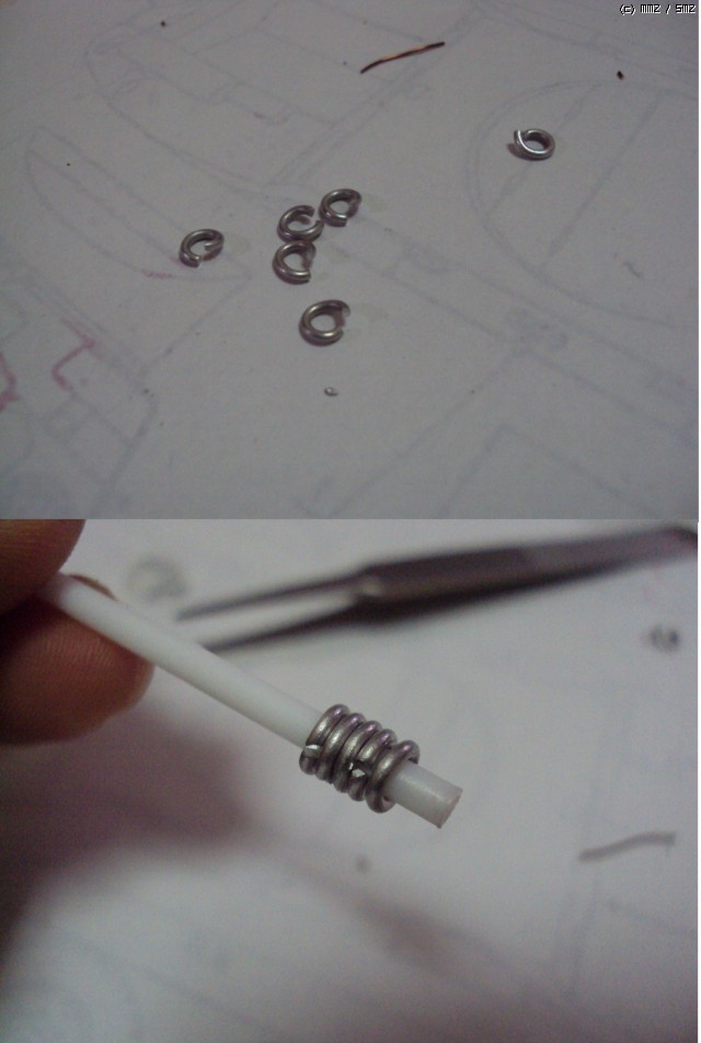 앞의 사진에 보이는 차체 앞뒤의 견인 고리를 제작하는 과정. 적당한 사이즈의 플라봉에 굵은 철사를 감고용수철형태가 된 녀석을 빼낸 후 니퍼나 가위 등으로 하나 하나씩 잘라줍니다.