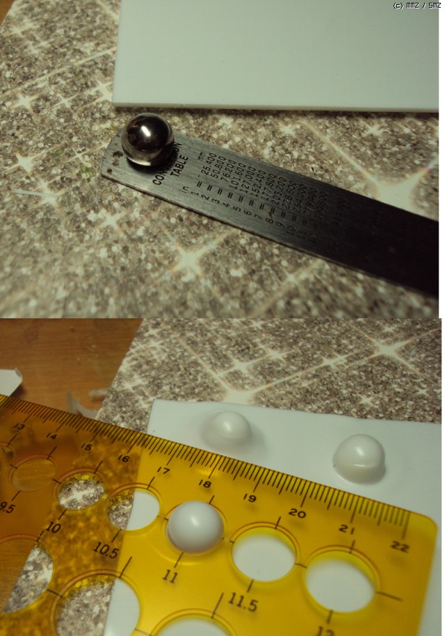 이 때 원하는 사이즈와 정확히 일치하는 쇠구슬이 꼭 있어야 할필요는 없는 듯 합니다. 쇠구슬과 원하는 포방패 사이즈 사이의 차이는 플라판의 두께를 조절하면 어느정도 커버할 수 있는 듯 합니다.