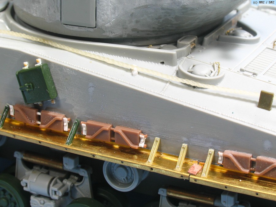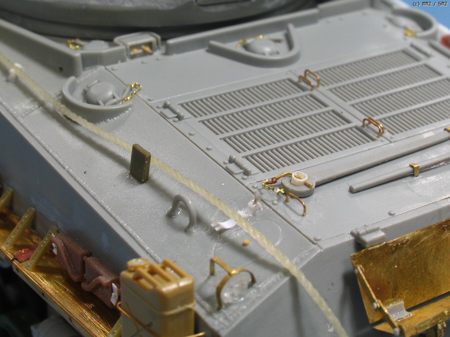 아카데미 차체에는 있고 드래곤에는 앞쪽의 생략된 와이어 걸이를 실차와 비슷하게 만들어 붙이니 접착을 안해도 고정이 되네요. 와이어는 나일론 실에 묽은 순접을 먹여 굳혔습니다.