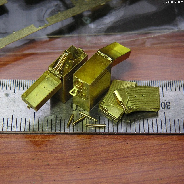 탄박스 10개 탄창20개...손톱한마디도 안돼는것들이지만.....만들다보니 보름가까운시간이 훅~하고 지나가버리더군요..에칭제품 조립이 이렇게 힘든지 몰랐습니다...순접떡칠에 제대로 붙지도 않고....ㅜㅜ