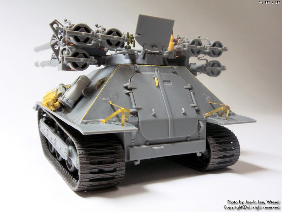 S. Zaloga씨의 작례에선 로드휠 가드의 위아래 조립에 오류와 부실한 설명서 때문에 몇몇 회원들 간 설왕설래했는데 해당부품 안쪽에 차체에 접착된 서스펜션부품과 연결할 수 있도록 핀이 조각된, 쉽게말해 좌우가 구분되는 비교적 큰 부품이라 여느 키트 만들 듯 조금만 주의하면 어렵지 않게 조립할 수 있습니다.