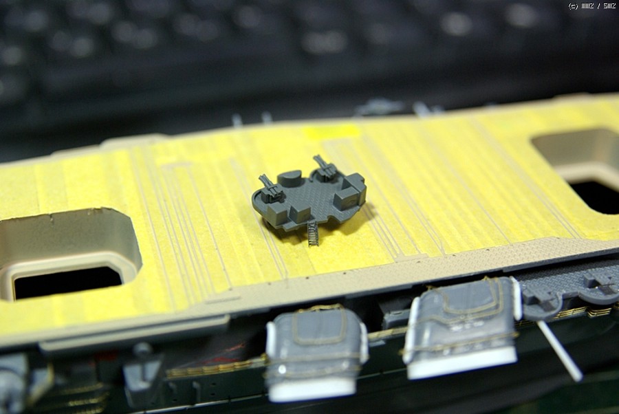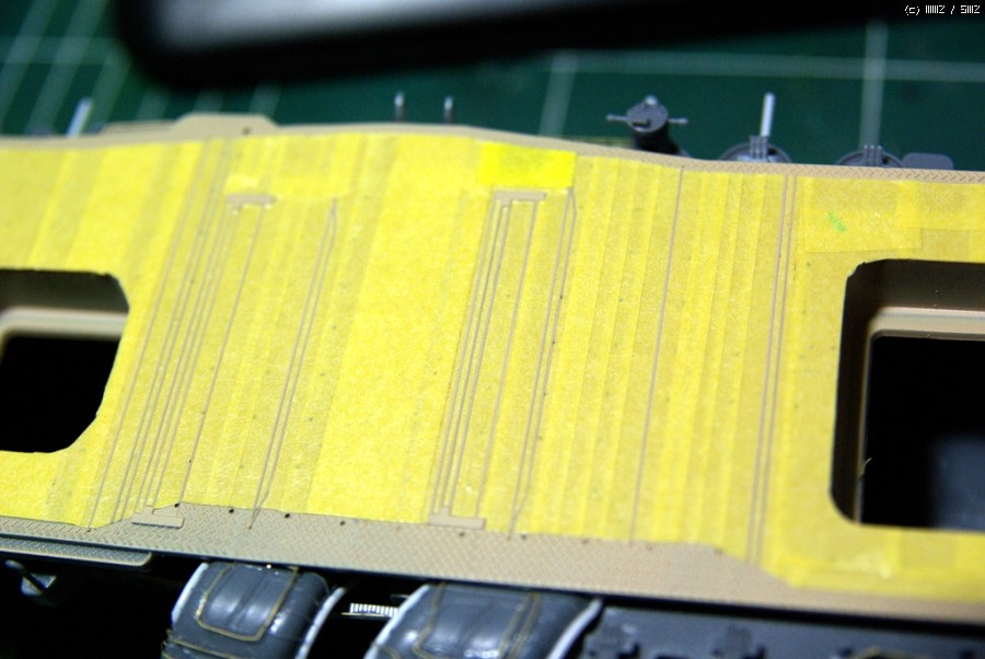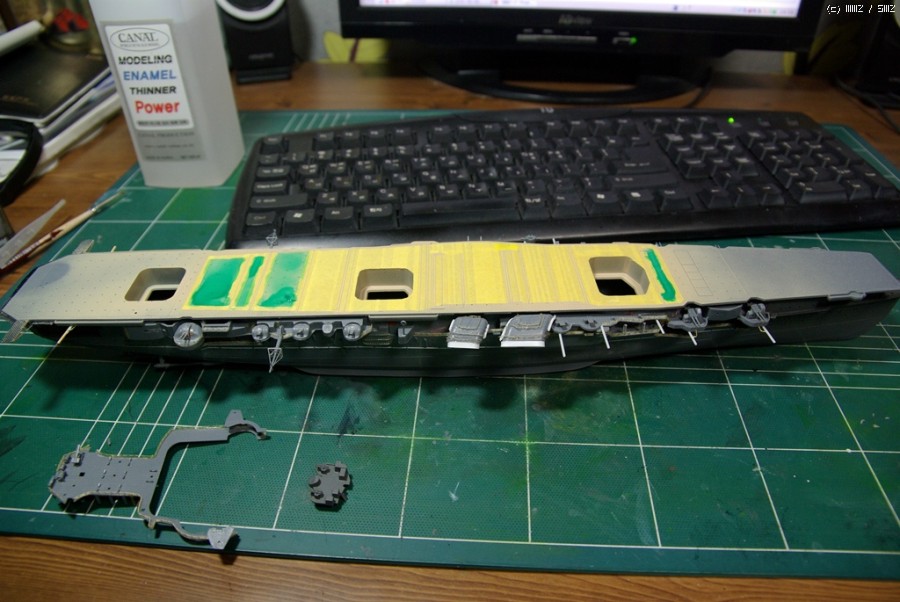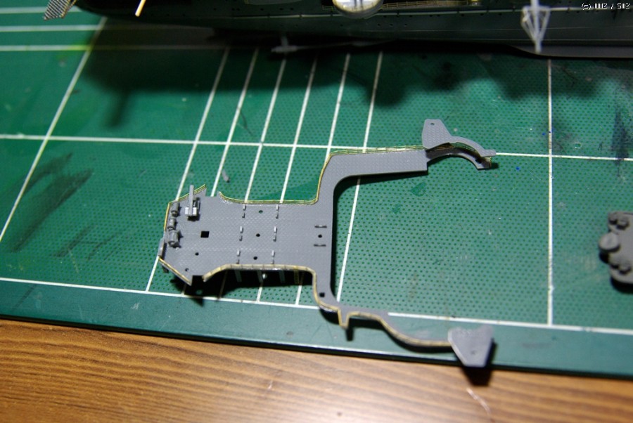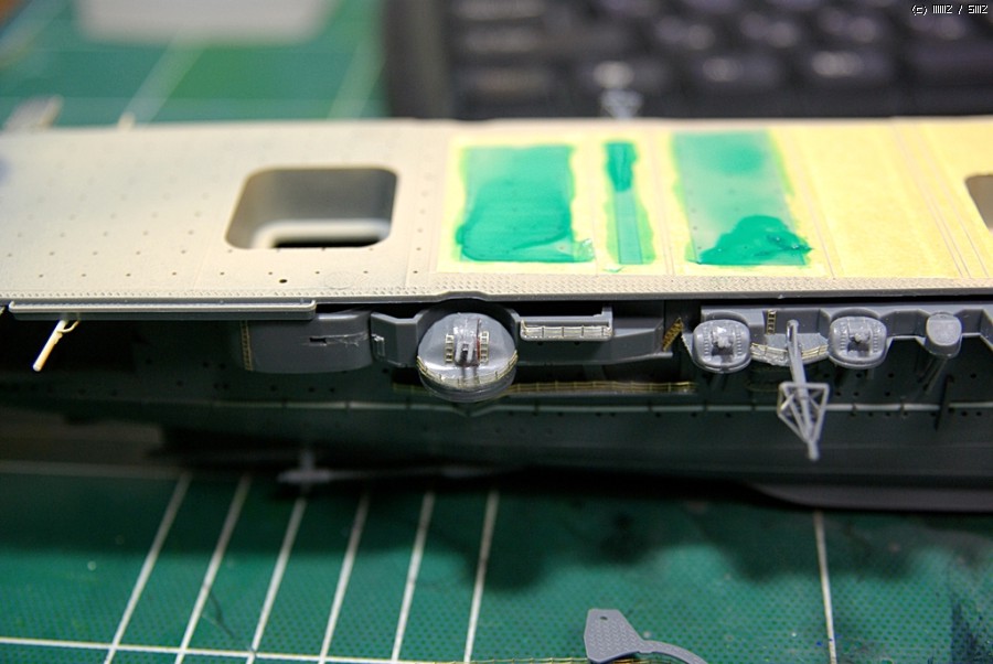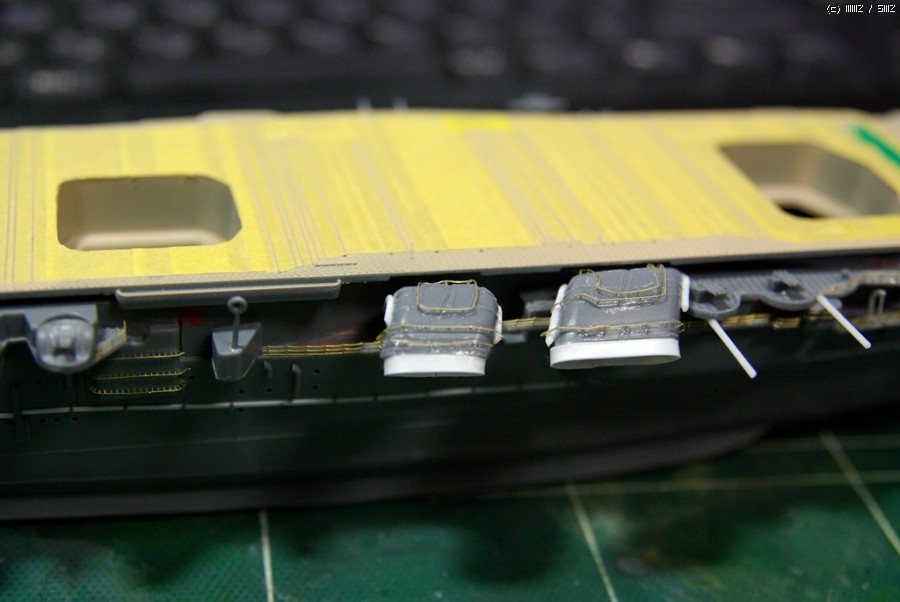 비행갑판 양 끝부분이 평평한 플라스틱으로 되어 있어서 싹 밀어버리고 런너를 얇게 뽑아서 자작 해줬습니다.