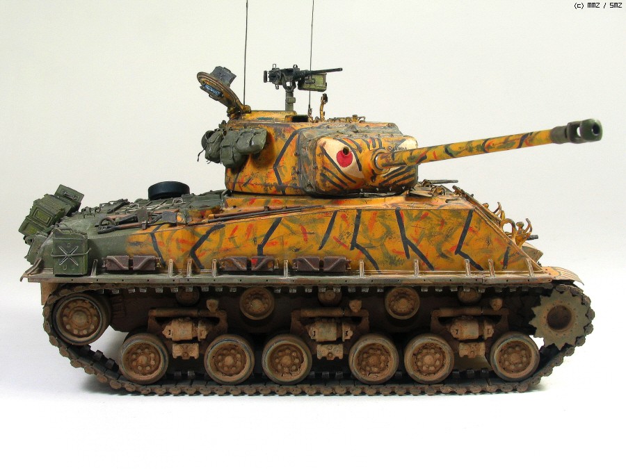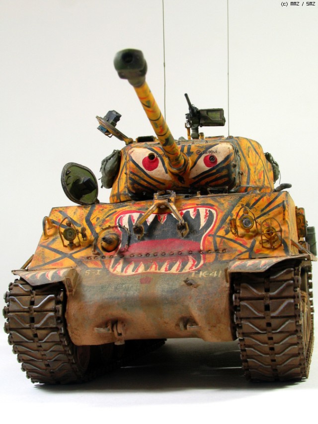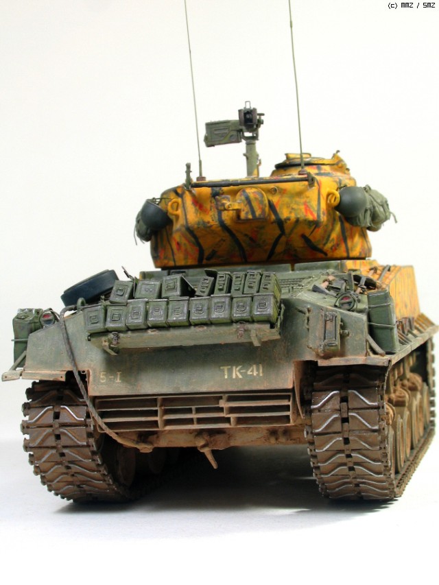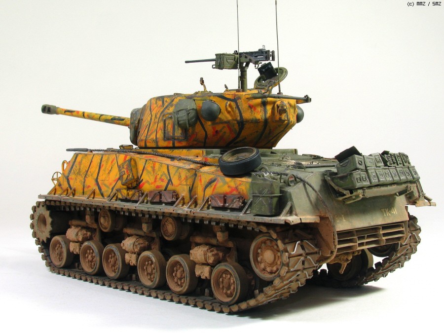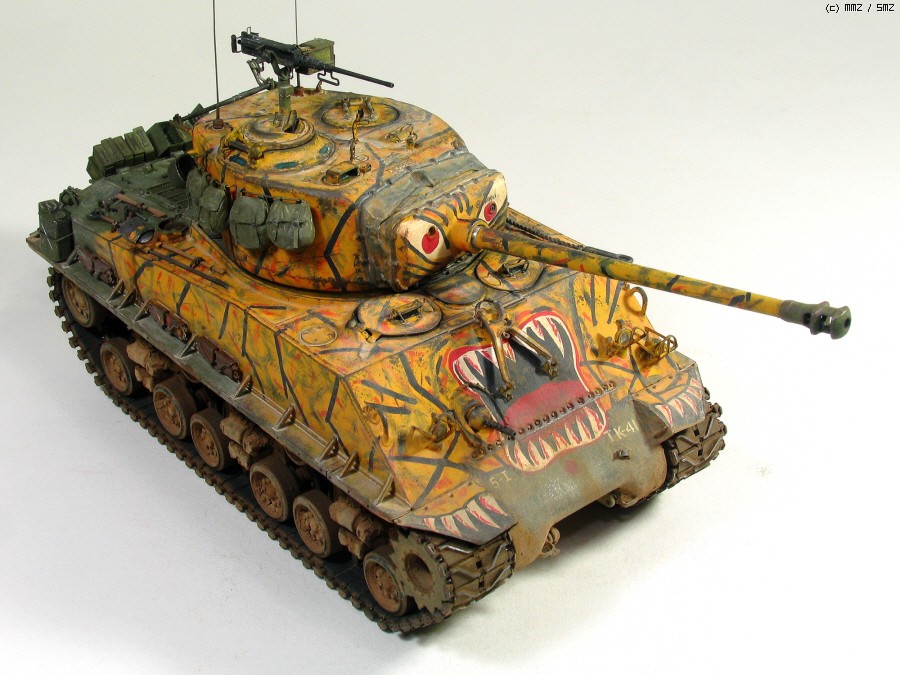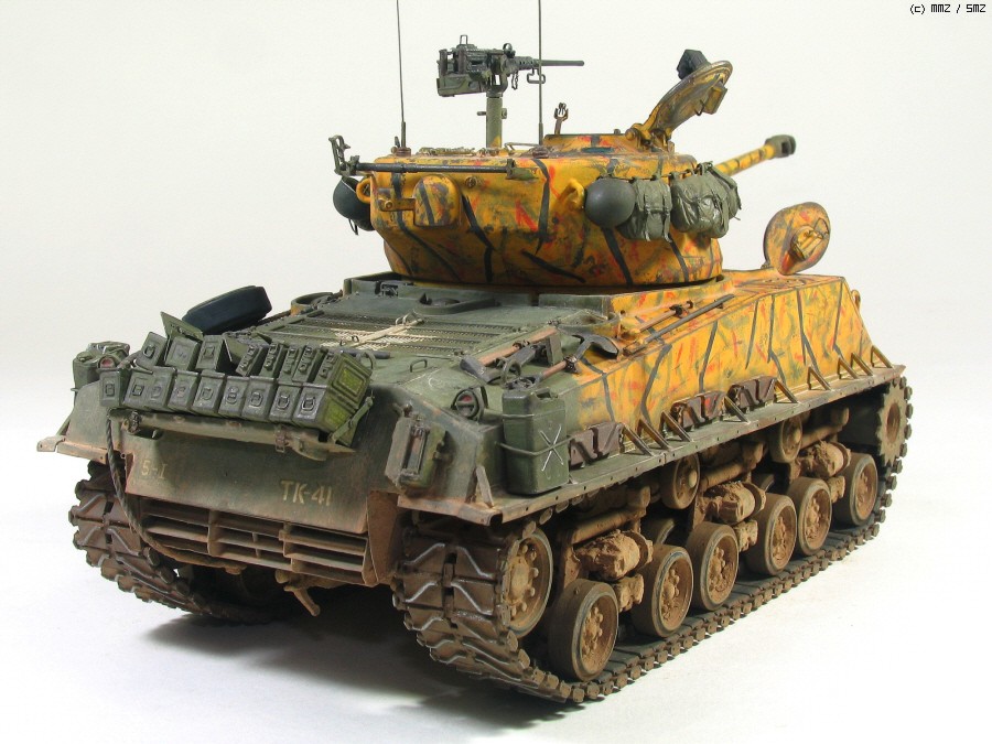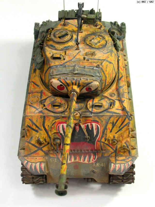타미야 박스로도 유명한 문양인데 소속은 미 제 5보병연대 전차중대 같습니다. 차체 전면 아가리 밑에 작은 빨간 5각형이 연대 마크입니다. TK-41은 임의로 붙인 데칼 짜집기로 실차사진(45번)을 살짝 빗겨간 꼼수로 동시에 타이거 위장 범위도 도면보다 임의로 넓혔습니다.
