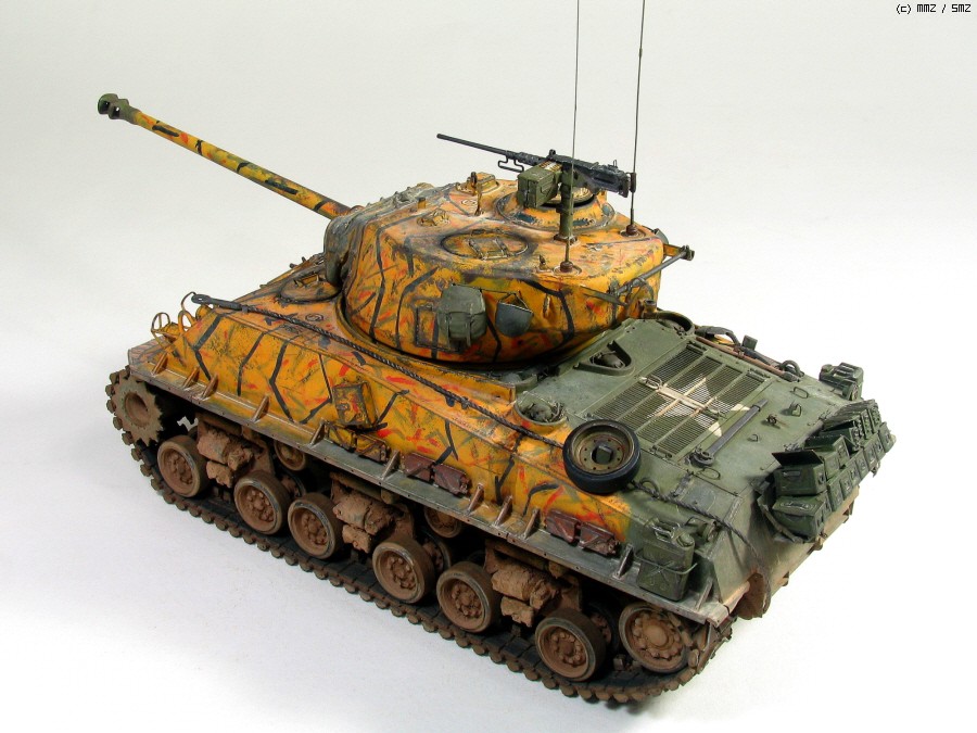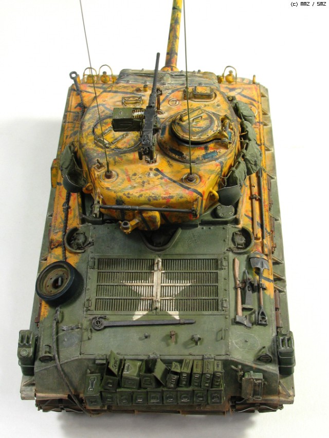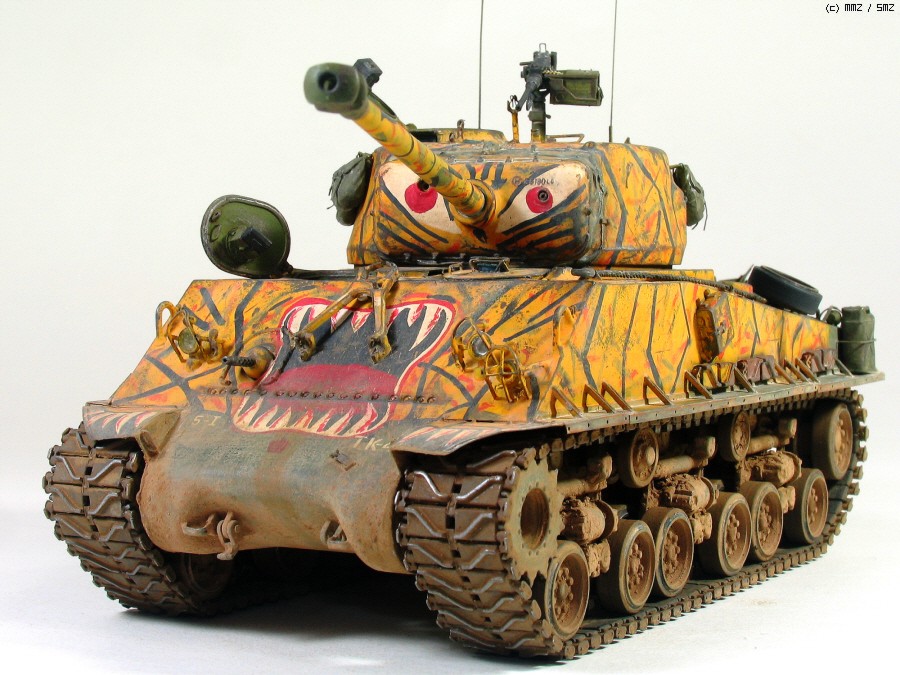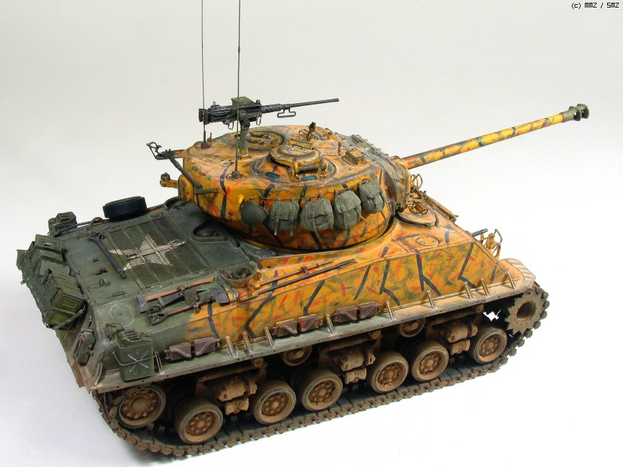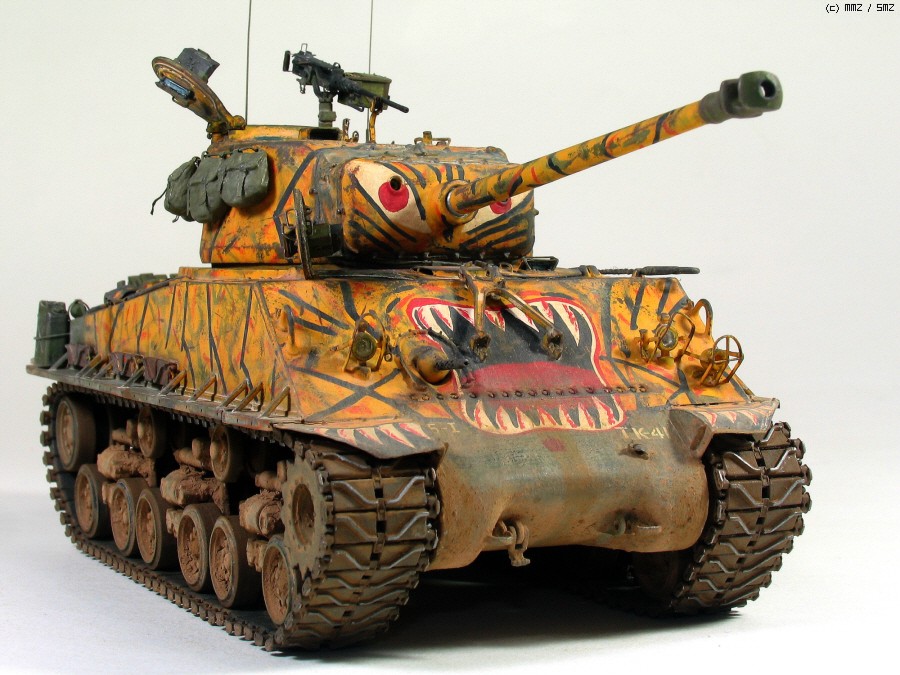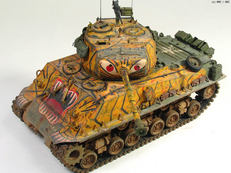 타미야 박스로도 유명한 문양인데 소속은 미 제 5보병연대 전차중대 같습니다. 차체 전면 아가리 밑에 작은 빨간 5각형이 연대 마크입니다. TK-41은 임의로 붙인 데칼 짜집기로 실차사진(45번)을 살짝 빗겨간 꼼수로 동시에 타이거 위장 범위도 도면보다 임의로 넓혔습니다.