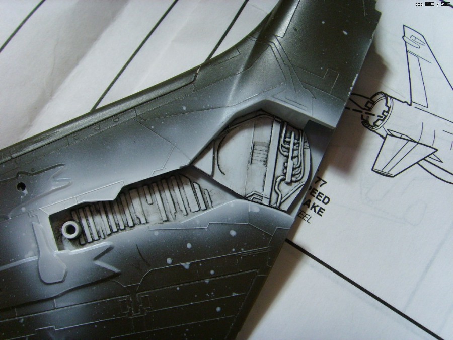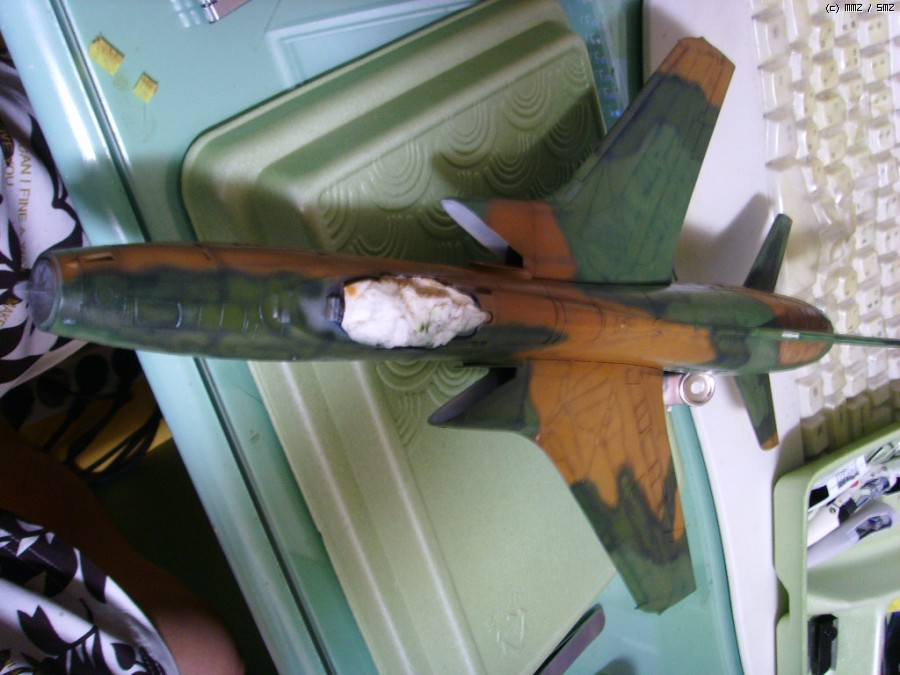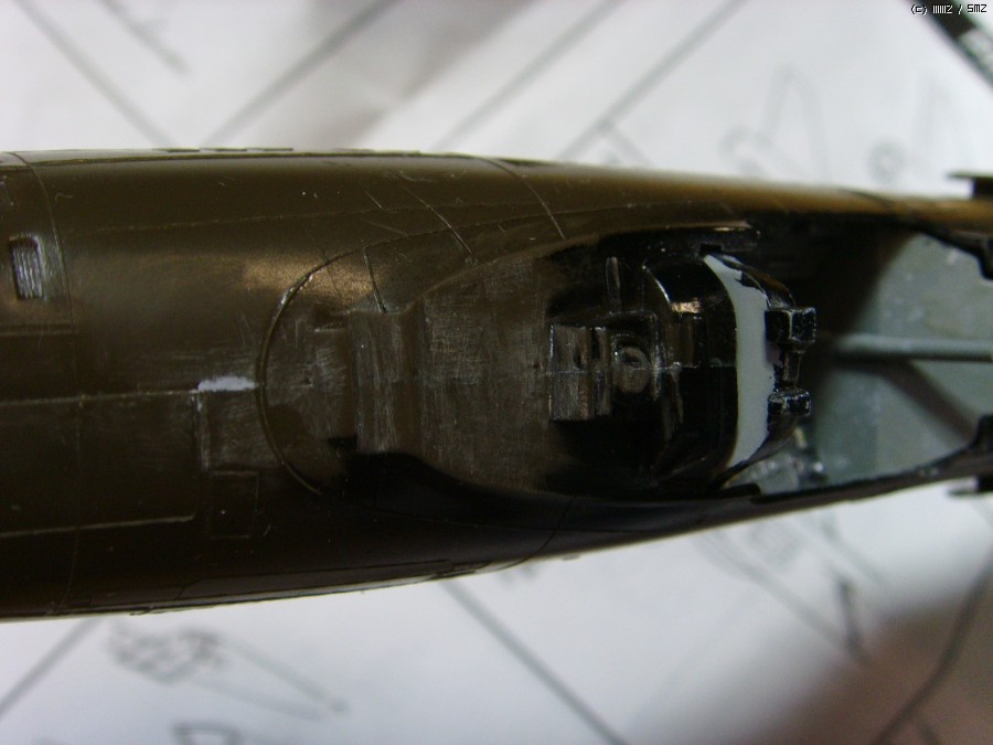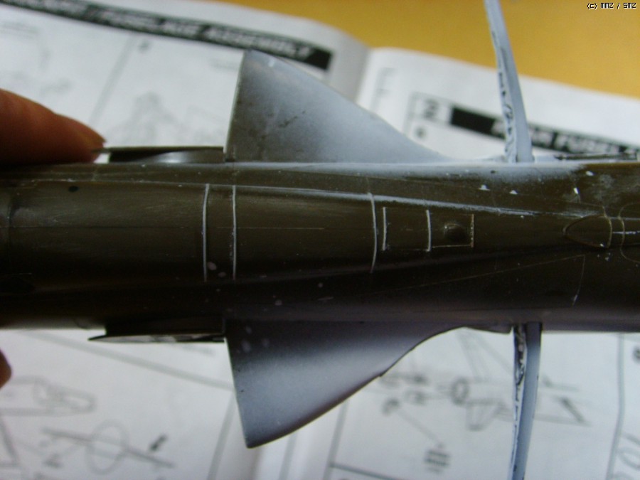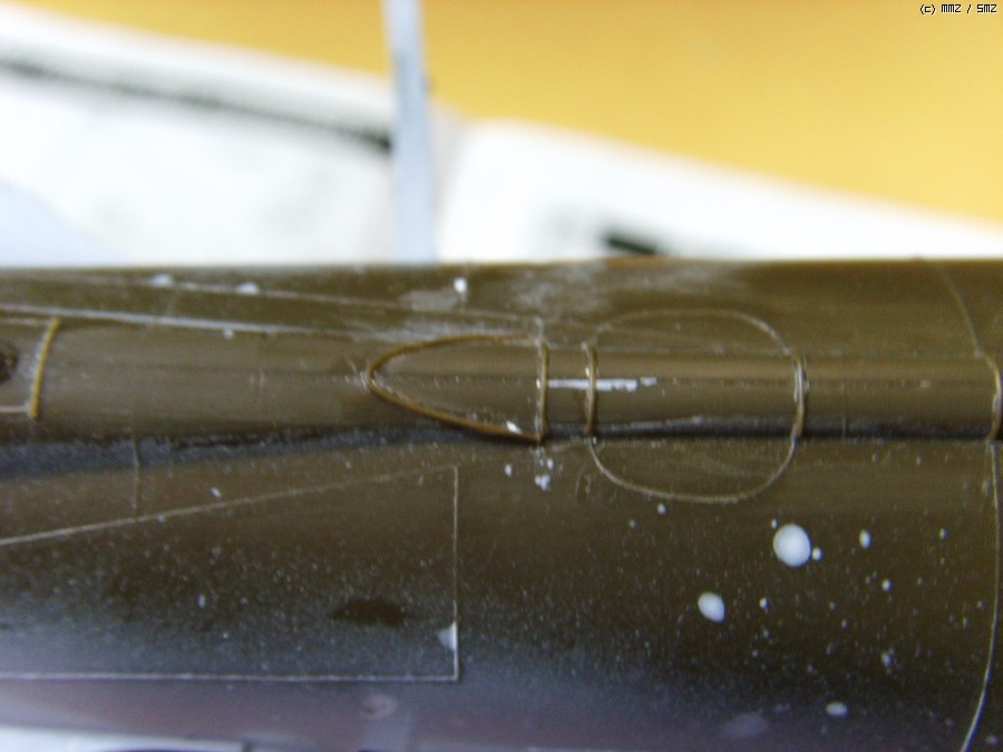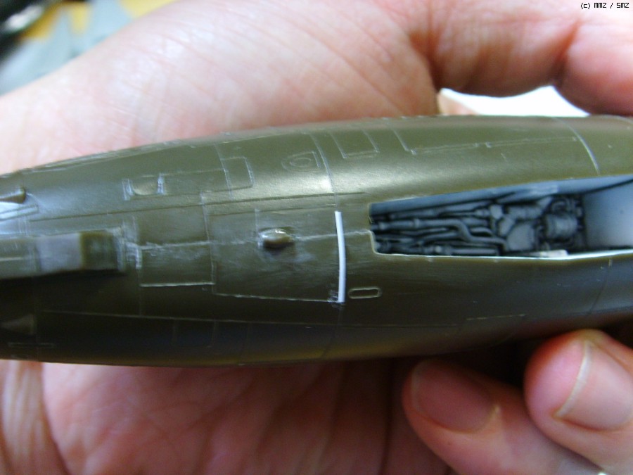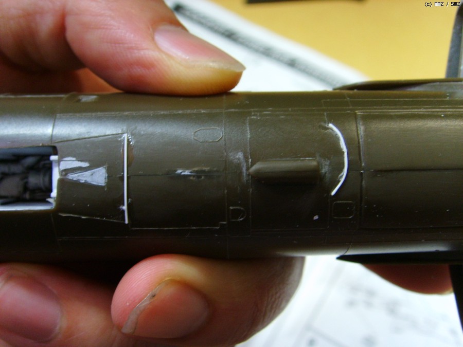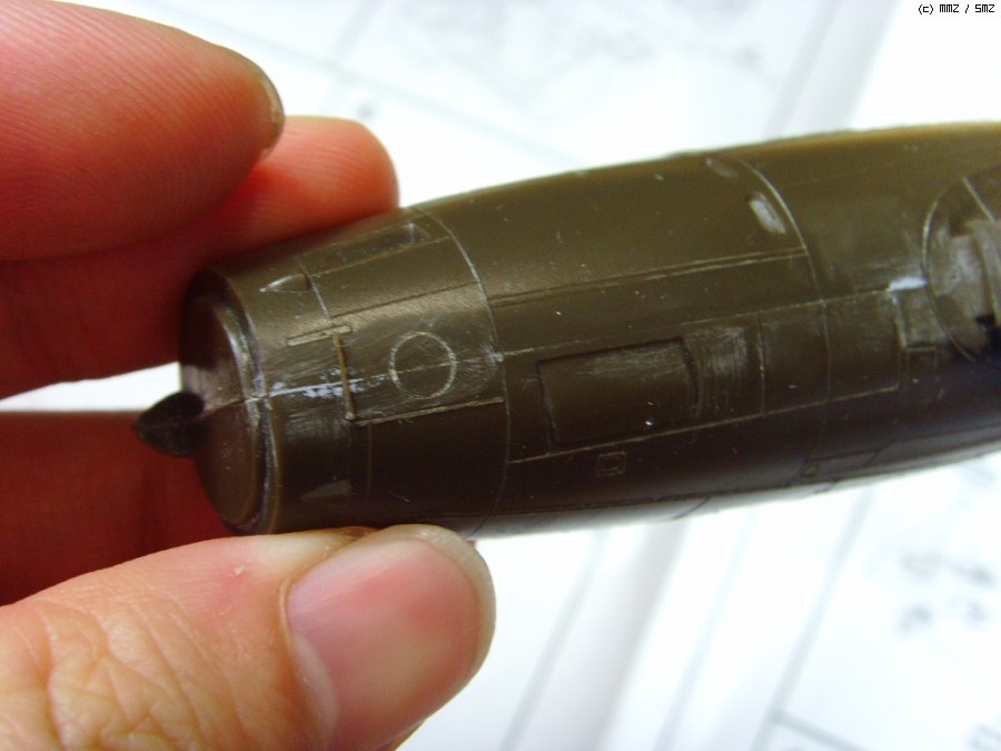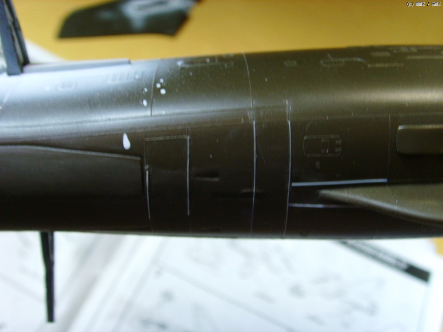 별 다른 큰 볼거리 없이 빠른 제작이 목적인 녀석이므로 콕핏도색 대충하고 바로 동체 접착한 후 사포질, 그리고 +몰드를 살릴것이므로 런너늘린것으로 밀려나간 몰드를 수정해줬습니다.