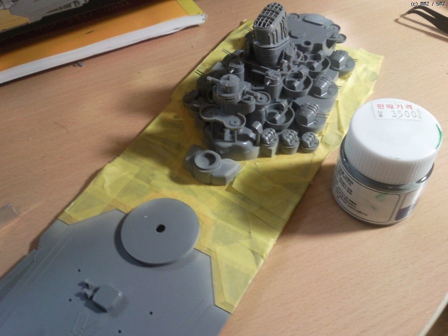 저 굵기가 약 6mm정도인데 러너 둘레가 그거에 훨씬 미치지 못하여 러너 자른 후에 마스킹 테이프로 6mm 될때까지 둘둘 말아서 만든 겁니다. 도장은 나중에 칠하기로 맘 먹고...