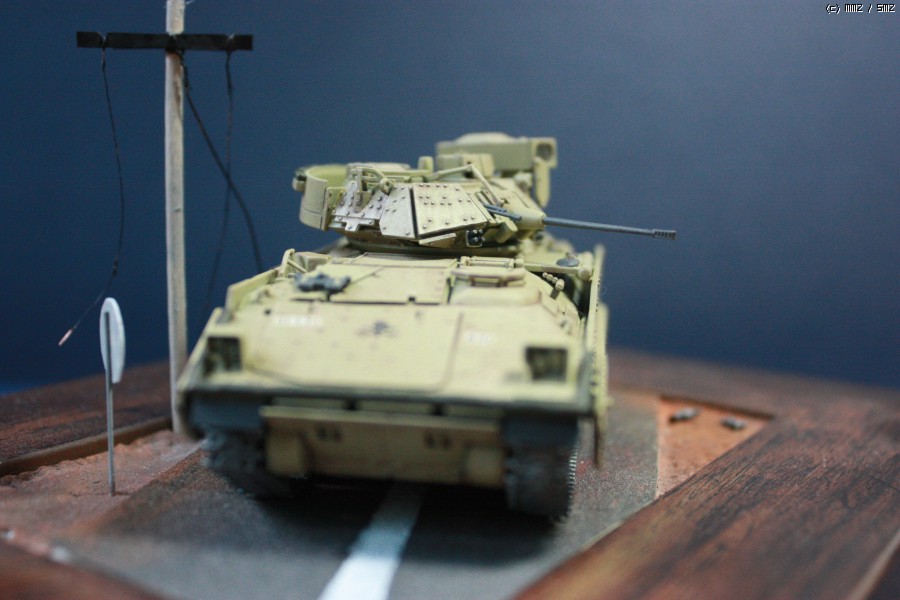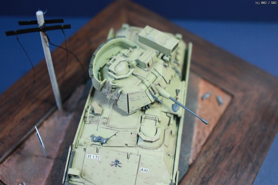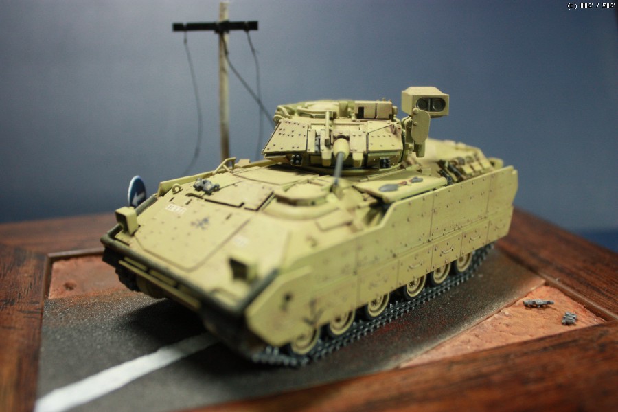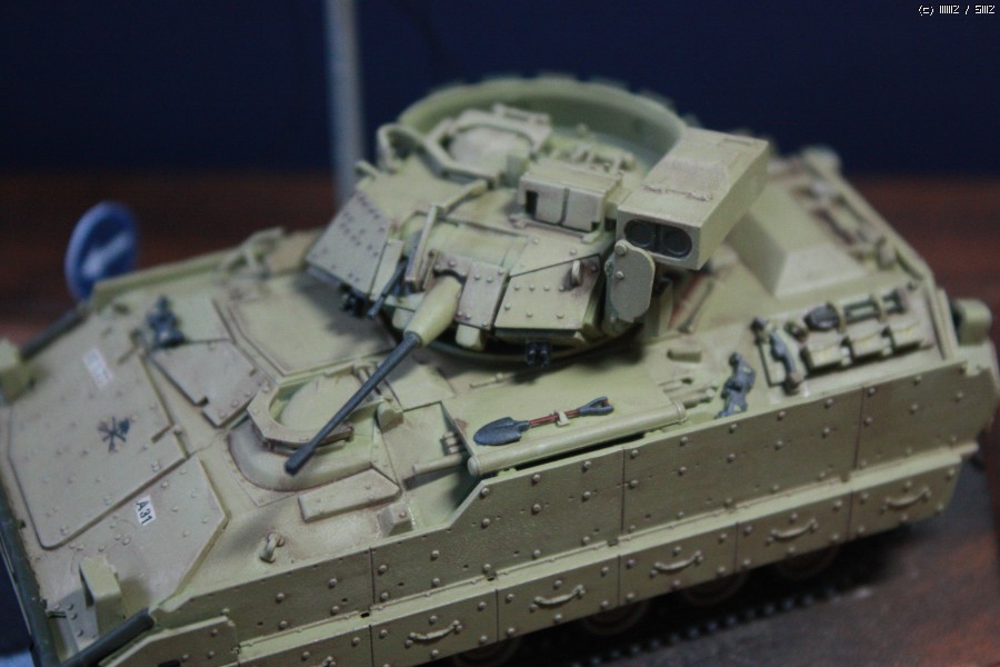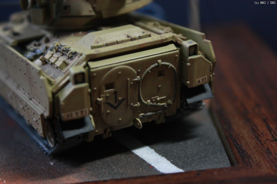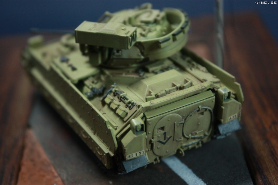 이 브래들리는 서페이서 후 타미야 락카로 기본도색후 장비를 도색한 후 전사지 작업 후 탑코트를 올렸으며 워싱까지만 하고 웨더링은 일체하지 않았습니다.
