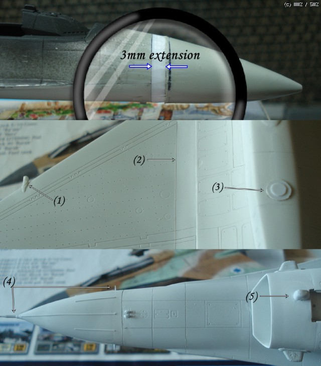 두번째 사진에서, (1) Radar warning receiver (RWR) 만들어주기..프라봉과 순접을 이용해서 만들어주었습니다. 프라봉을 일단 붙이고 순접으로 주익위의 돌출부분을 성형?해주었다고 해야할 것 같네요.. 상면만 저리 표현해줬습니다. (2) 패널라인을 추가로 넣어주었습니다. 리벳팅은 뭐랄까요. 어느정도 찍어주려니 손대면 한참 걸릴 것 같아서 추가 리벳팅은 생략하기로 했습니다..역시 이런 면에서 타미야 킷이 좋습니다..비싼 값을 하는거죠^^ (3) 실기사진을 보니 저런 것이 있던 뭔지는 모르겠네요..프라판 0.5mm짜리 원형으로 잘라서 두장 덧대어 만들어줬습니다. 세번째 사진에서 (4) 하비데칼사에서 나온 메탈 제품으로 피토관과 AOA probe 교체작업과 레이돔의 라이트닝 스파이크를 런너 늘린걸로 대체,