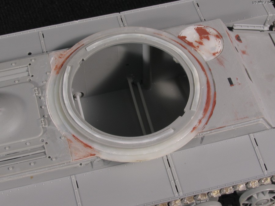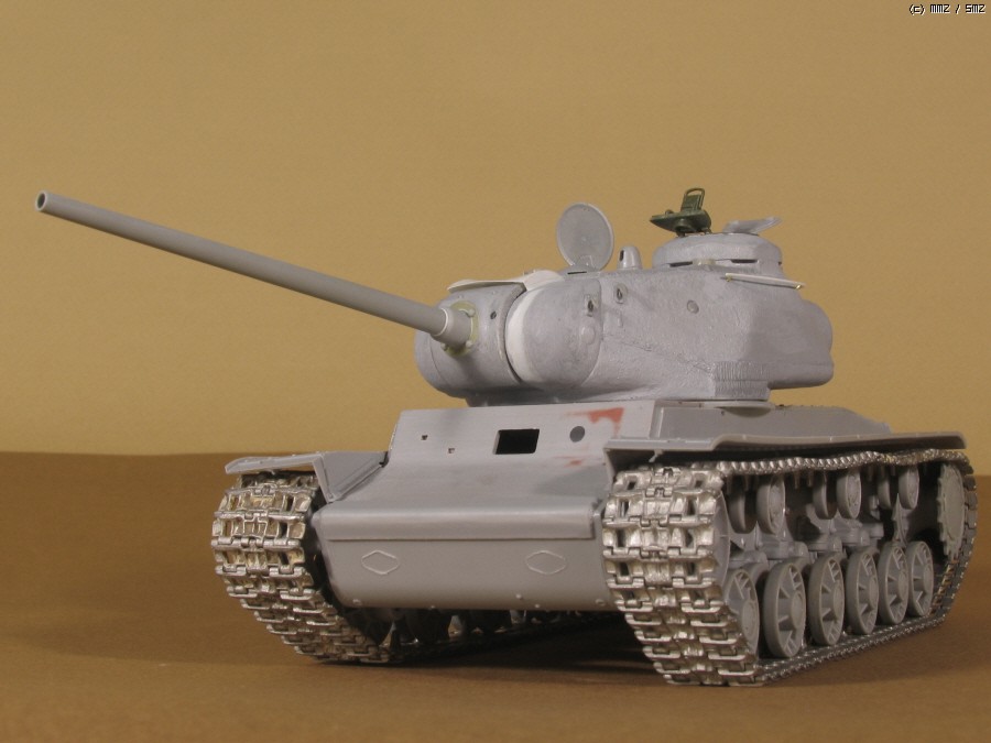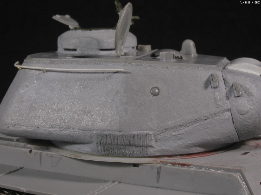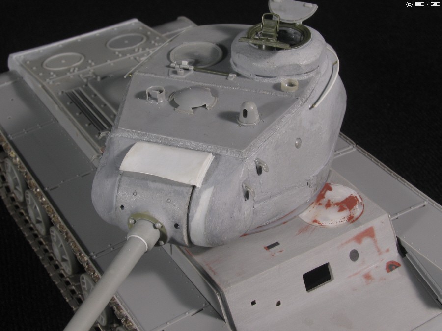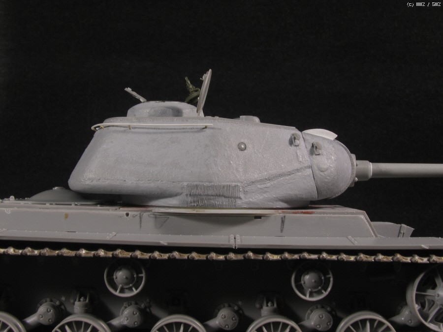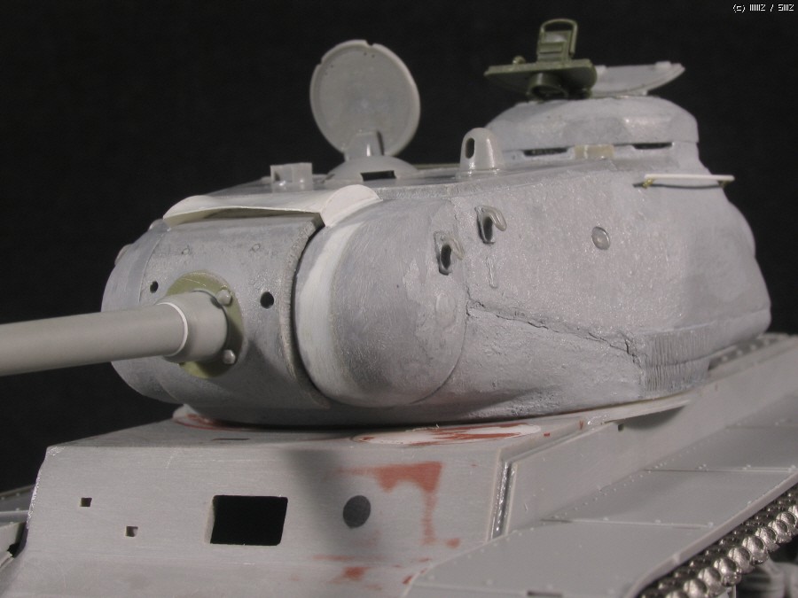 전차장 큐폴라는 초기형 JS에 맞추어 울퉁불퉁한 즈베즈다 형식을 거친 사포로 갈아내어 다듬고,영아닌 즈베즈다의 해치부분은 타미야 JSU-152에서 남는부품을 이용했습니다. 문이 한쪽만 남아 나머지 한쪽은 원키트의 장전수석부분을 잘라 쓰고,장전수 해치는 트럼페터 KV 조종석 해치를 이용...KV-85는 JS 와 같이 조종석 해치가 없답니다.