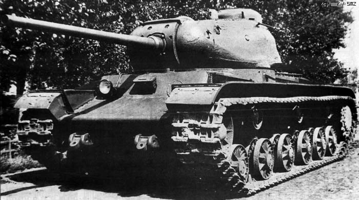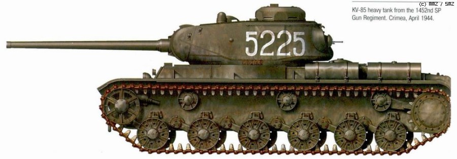 KV-85 의 개발도 소련이 JS-1전차를 만들면서 보다 빨리 실전 배치하려는 목적으로 KV-1S차체에 JS-1의 85mm포탑을 올린 것으로 JS의 생산이 시작되기 까지의 땜방역할이라 생산량도 100여대 남짓밖에 안되기 때문에 자료 사진도 찾기 어렵습니다. 실전의 스냎사진은 이게 유일하지않나 싶네요.