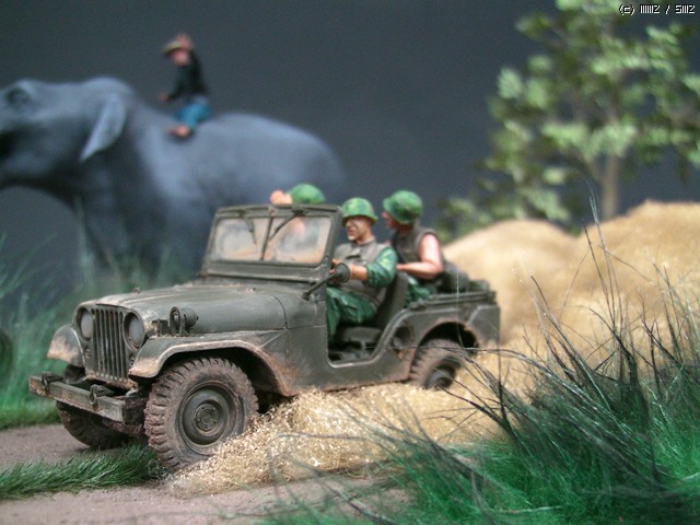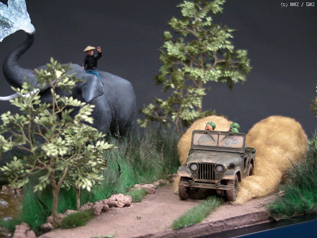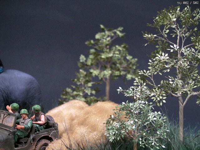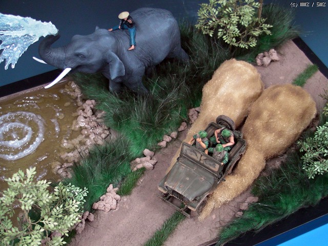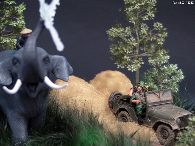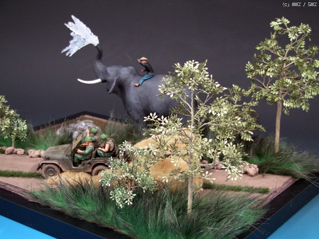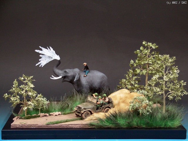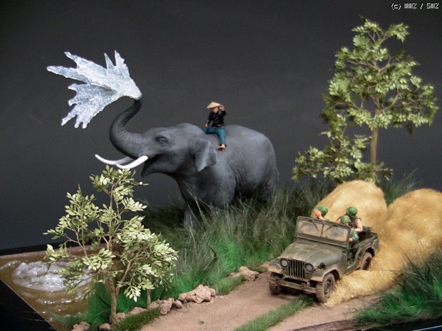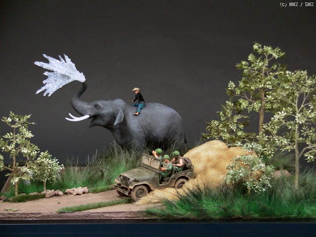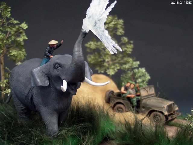 코끼리의 물뿜는 장면과 웅덩이의 물표현 및 차량의 달리는 먼지구름효과를