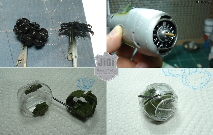 엔진 부분의 디테일은 인젝션으로 최고가 아닐까 싶습니다. 배선까지 들어있으니까 말이죠..우선 검정으로 칠한다음에 메탈릭 도료를 사용합니다...배선을 포함한 앞부분은 메탈을 칠했구요.. 프로펠러는 철심으로 고정하기로 하고 작업을 했습니다..