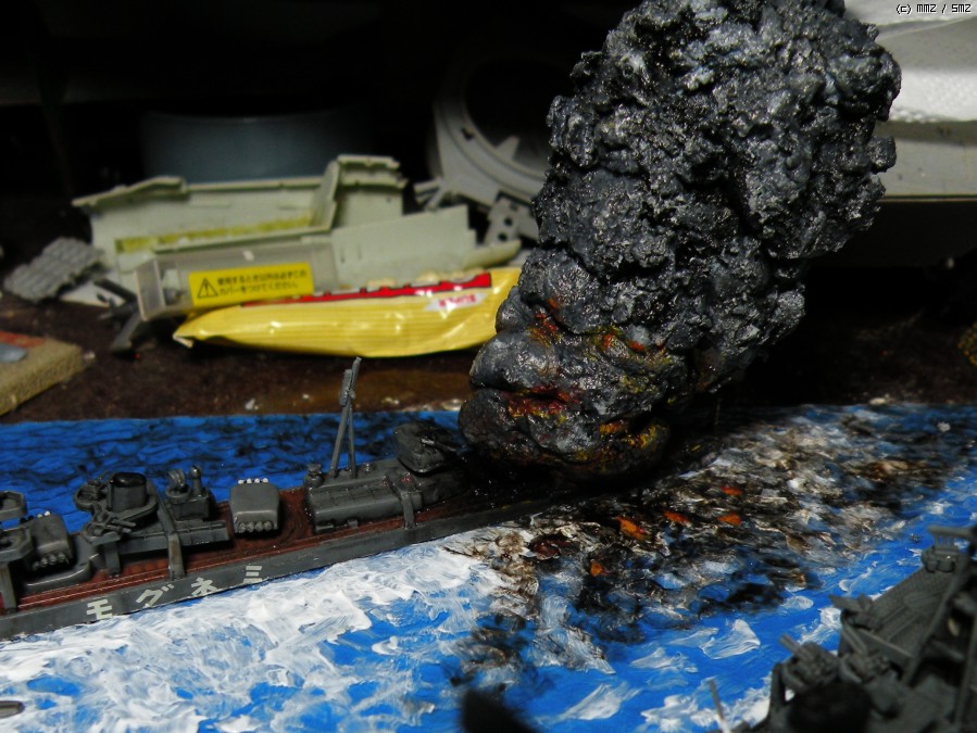 이쪽은 좀 회색을 많이 사용해서 연기에 입체감을 연습해봤습니다. 중유가 타는 연기가 아주 새카맣기 때문에 이렇게 밝게하는데 좀 용기가 필요하네요. 마른 후에 밝은 회색으로 드라이브러싱이라도 해봐야겠습니다.