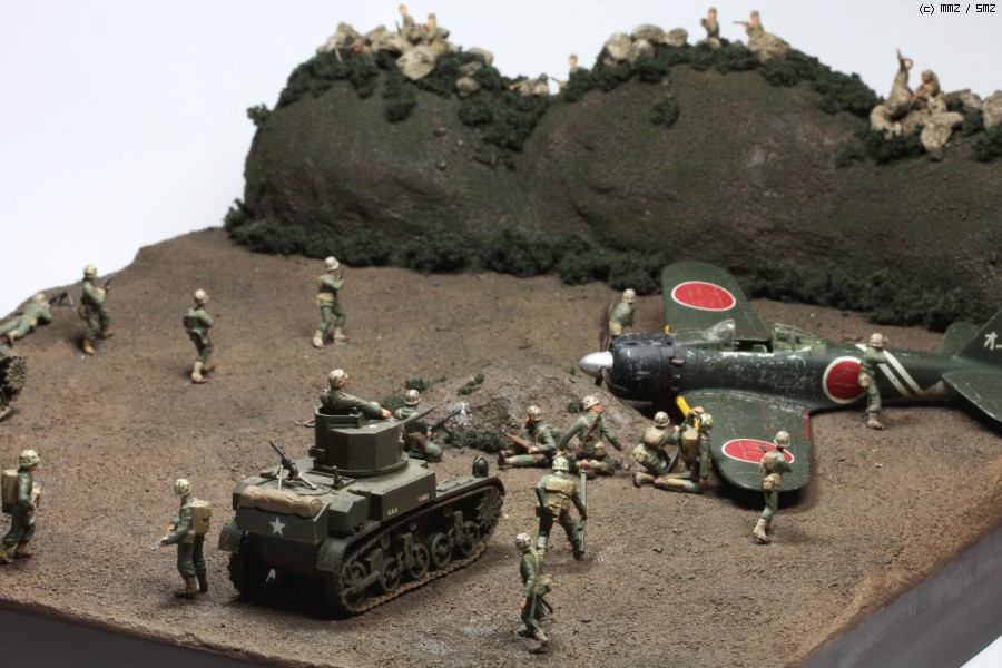이오지마에서 일본군과 전투를 치룬 미 해병대의 모습을 제작해보았습니다. 미해병대군복색감은 영화 퍼시픽을 보며 험브롤을 조색하여 표현해주고 일본군은 이오지마에서 온 편지및 Osprey men at arms 일본군자료를 참조했습니다. 원 구성은 제로센과 일본군등장 없이 뽀족한 산을 만들어 전차에서 산까지에 원근감을 주는것이었는데 구성이 너무 약한듯해서 그냥 작은 언덕에 일본군이 방어하고있는 모습으로 변경을 하였습니다.