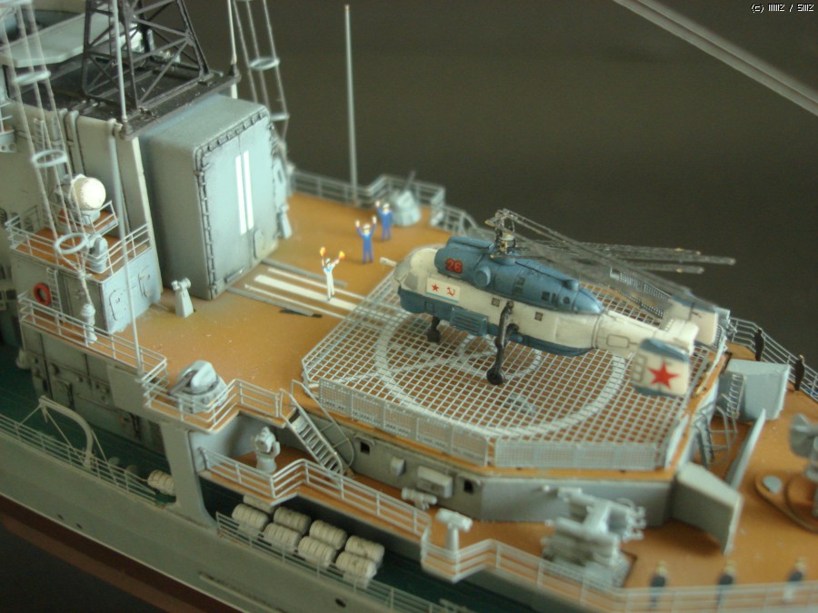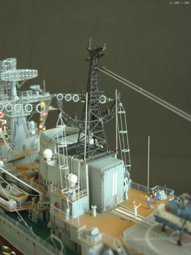 후방헬기: 헬기의 패널라인에다가 먹선을 넣어주었습니다. 실감나는 표현을 위해서 수병들이 헬기를 유도하는 장면도 연출해보았습니다. 그런데 날개까지 접은 헬기를 향해 수병들은 왜 저리도 열심히 신호기를 흔들고 있는 것일까요??? ^^