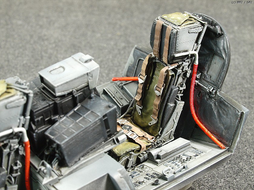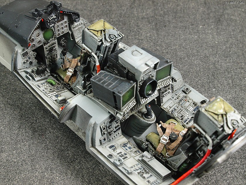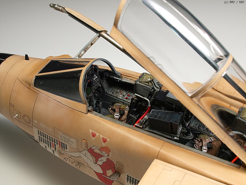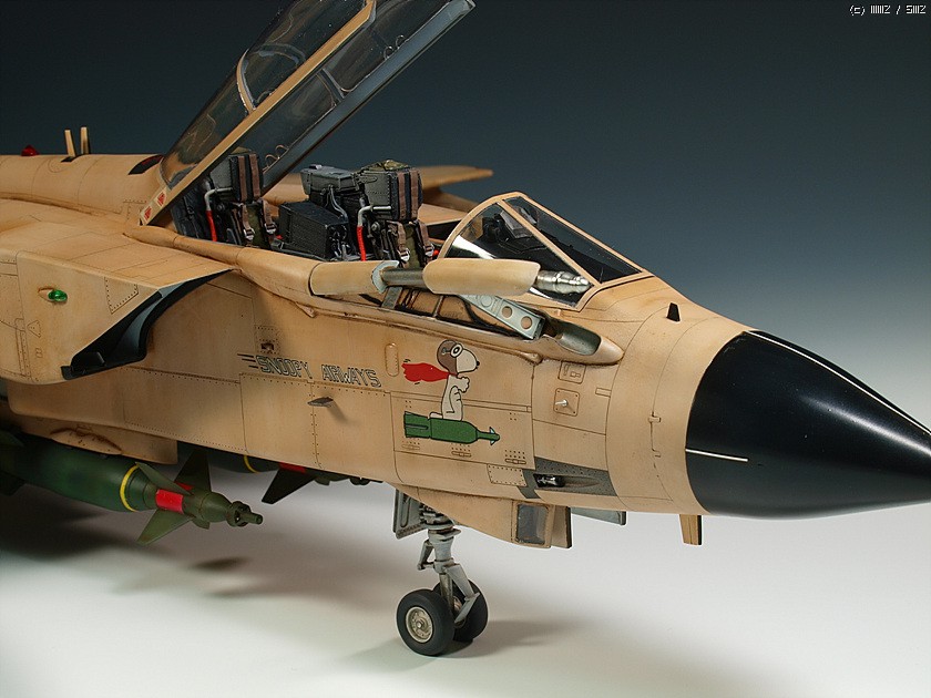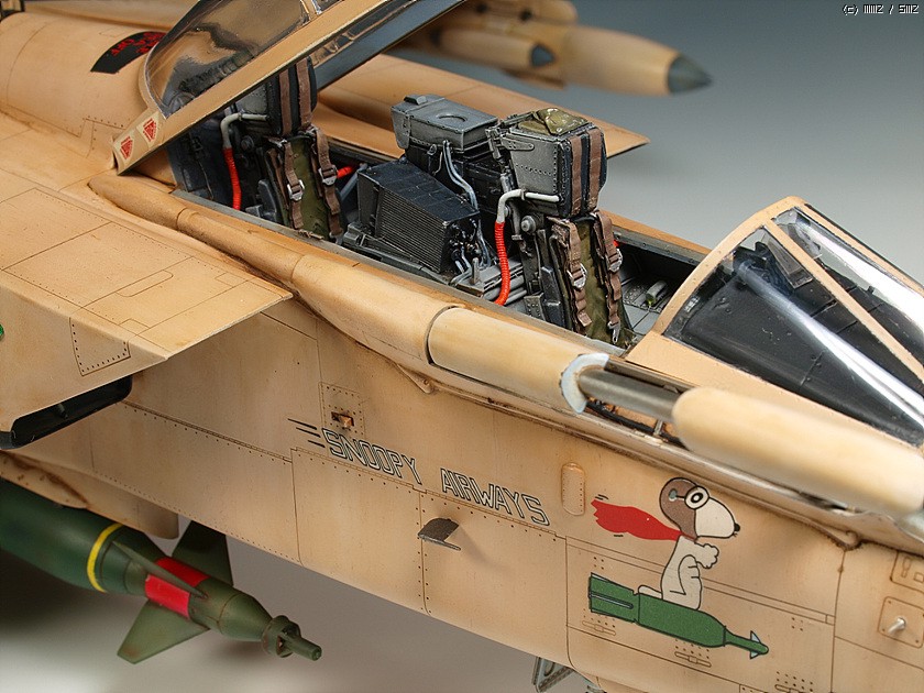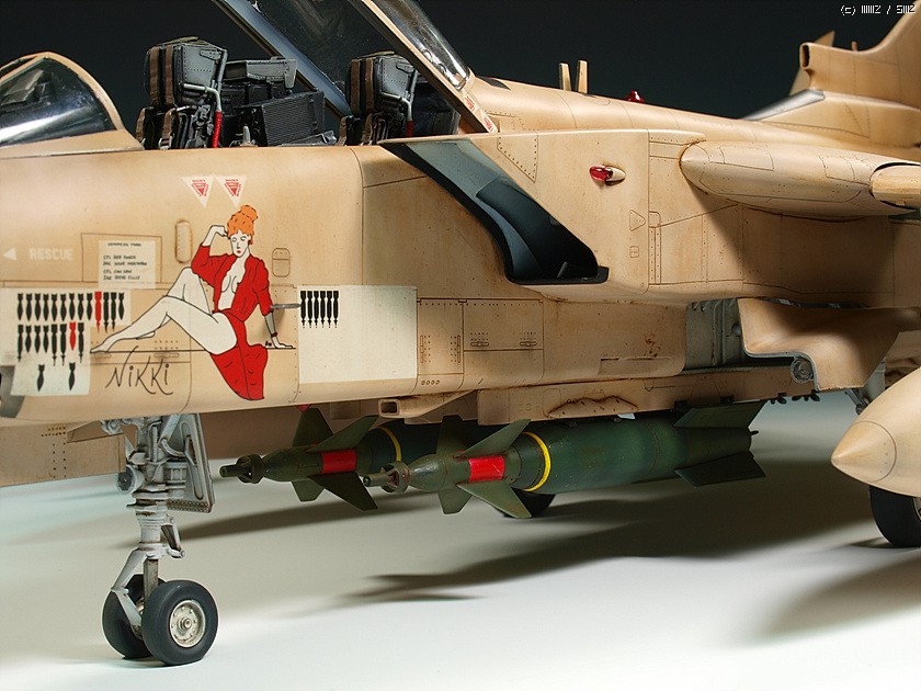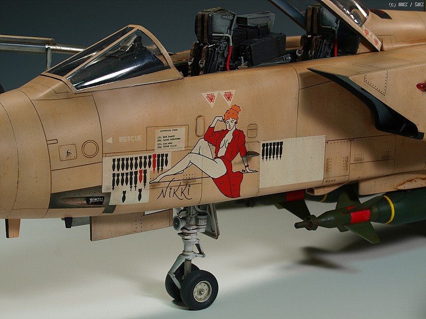 1/32 스케일의 킷은 오래전에 발매된 레벨제의 것이 유일합니다. 잊을 만하면 마킹을 바꾸어서 계속 발매되구도 있구요. 조립성이나 디테일은 좋습니다만 기수 하면과 동체 측면의 몰드들이 다 날라가있어서 제작시 손이 좀 가는 편입니다. 32 스케일로는 좀 심심해 보이는 콕핏, 노즐 그리고 가변익은 아이리스의 레진 세트들과 파라곤사의 플랩 다운 세트를 이용하여 디테일업 해주었습니다. (배보다 배꼽이지요. -_-) 마킹은 실전적인 느낌이 좋아 걸프전 당시의 참전기체를 재현해보았습니다. 밝은 톤의 단색 기체라 심심하지 않게 보이려고 노력은 했습니다만 여러모로 부족한 점이 많습니다.