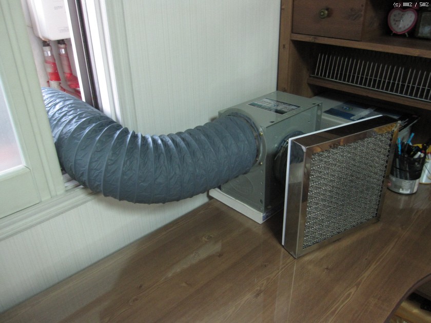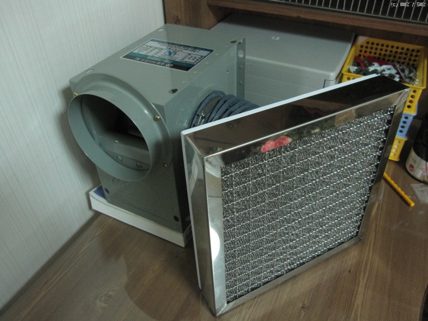 조금더 투자해 아까 위에 소개한 스틸밴드등을 이용해 튼튼히 조립하는것이 좋을듯 싶습니다!!시로코팬과 필터부의 중심 높이가 맞지않아 일단 책으로 높이를 맞췄는데,,,폼보드등의 재료를 이용해 받침대를 하나 짜줘야 할듯합니다!!