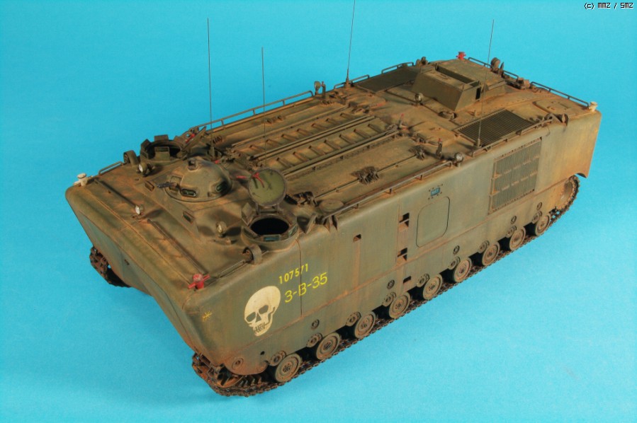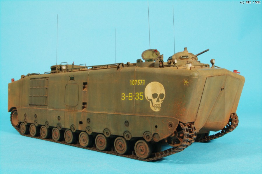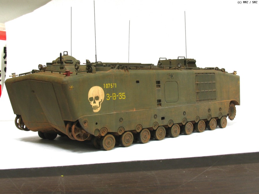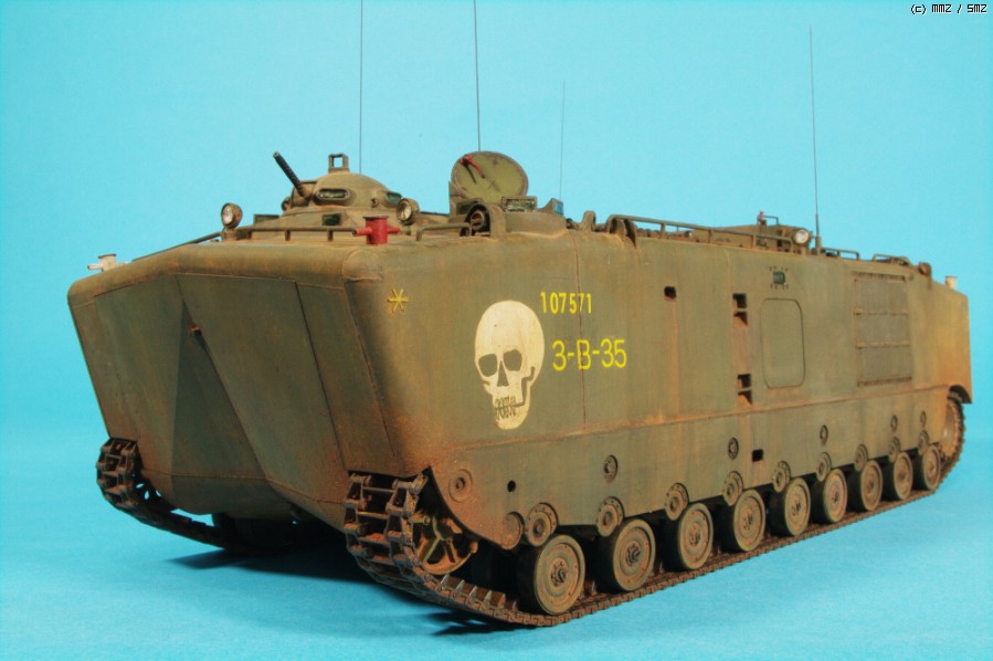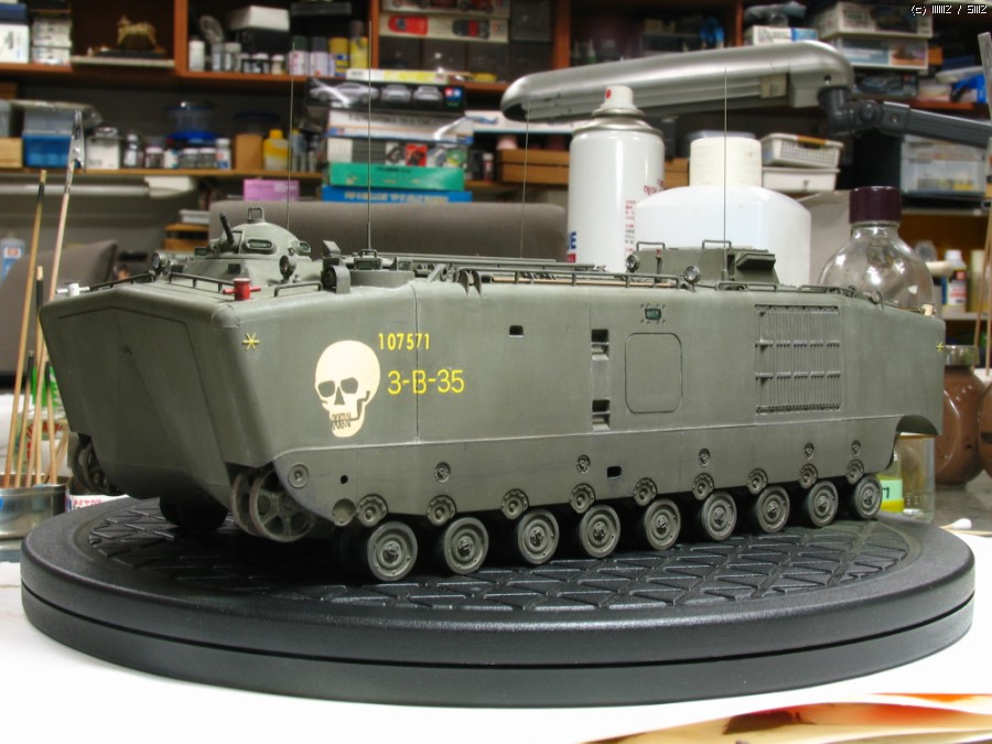 AFVCLUB 초기제품인 LVTP5A1입니다.차체 측면에 약간의 함몰된 곳과 상판과 옆판의 접착부위를 퍼티로 메꿔 다듬었고,점검해치등의 손잡이,여섯개 있는 라이트 몰드를 파내고 투명런너를 달구어 렌즈 교체와 30구경 기총 방열구멍등 조금씩 디테일 작업했고, 기본색은 험브롤 조색입니다. 해골그림은 키트의 데칼이 깨지면서(AFVCLUB이 좀 그렇죠)실패하여 스탠실과 세필로 그려 작업했습니다.제작중 모습은 포럼의 제작기를 보시면 감사하겠습니다.