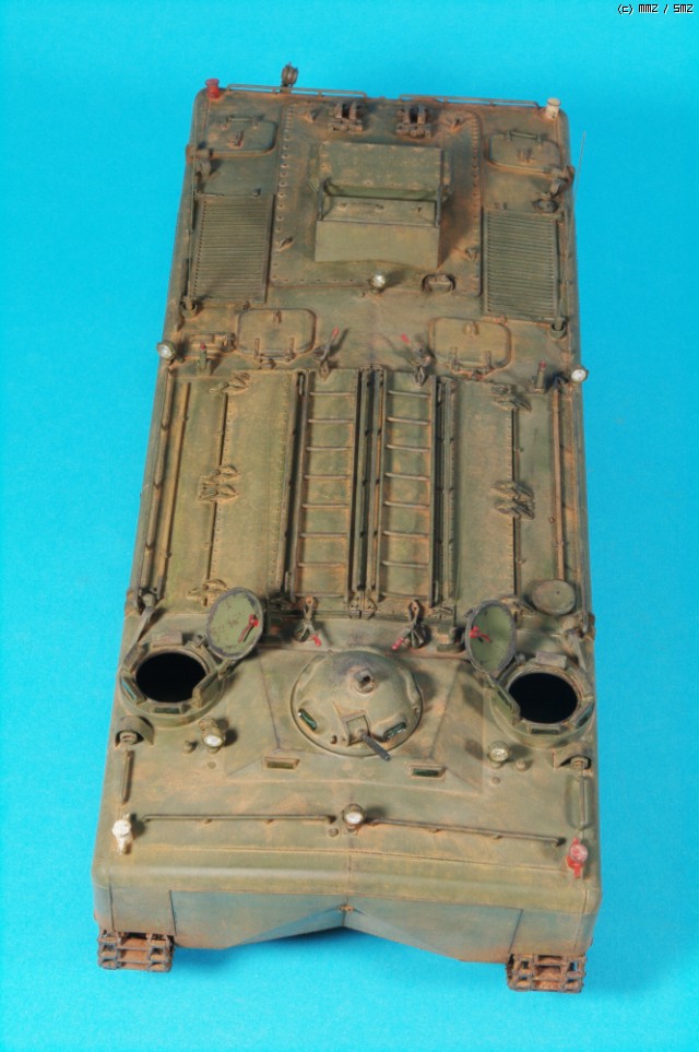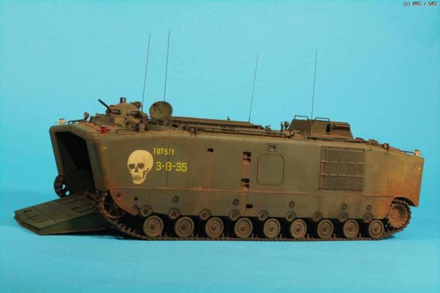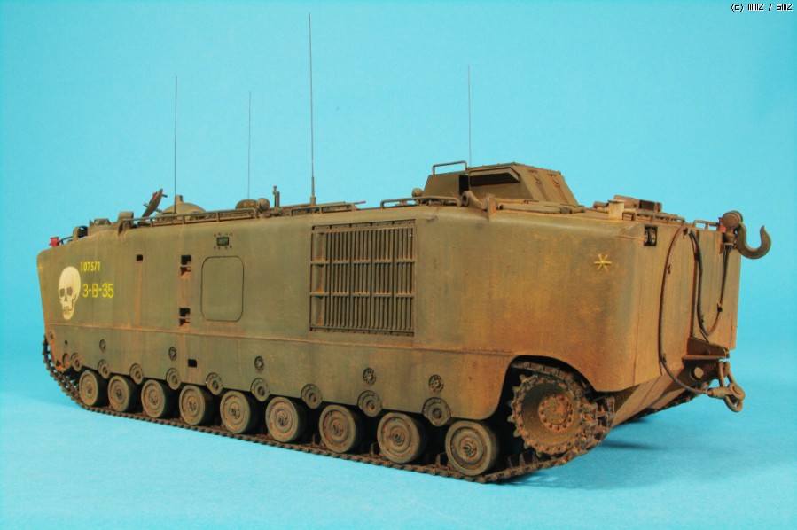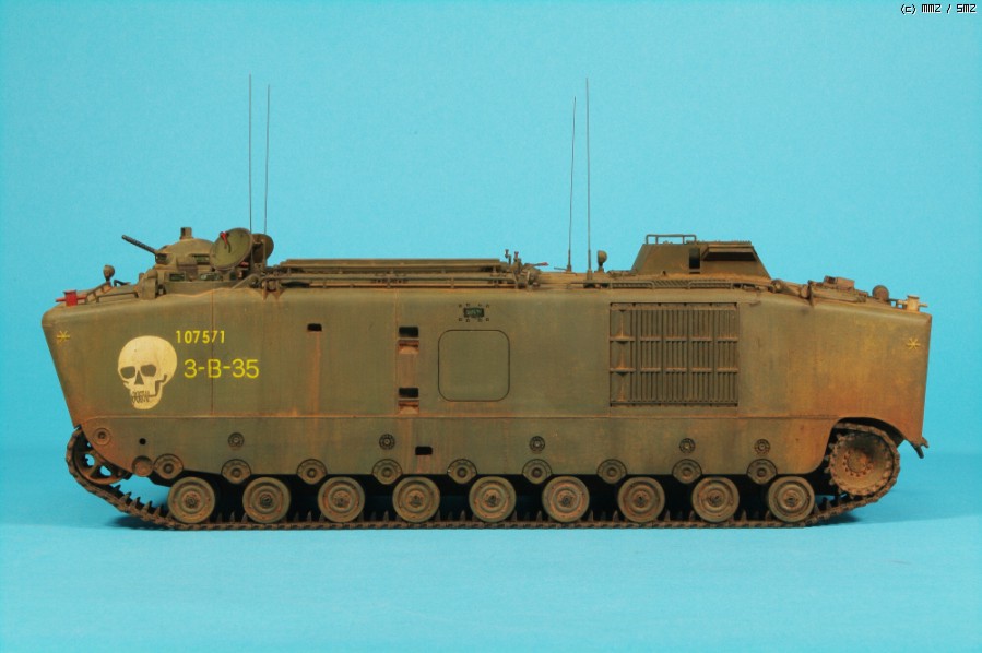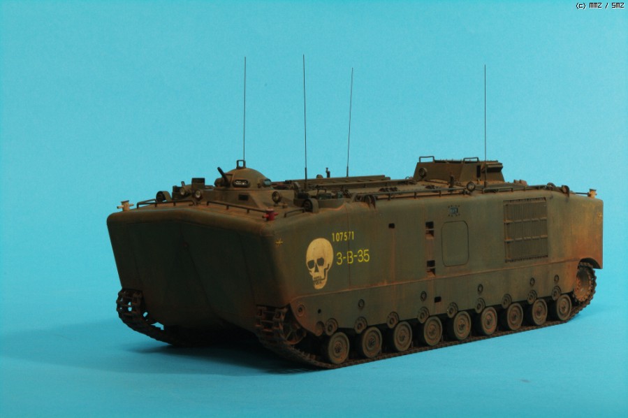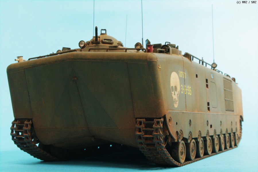 AFVCLUB 초기제품인 LVTP5A1입니다.차체 측면에 약간의 함몰된 곳과 상판과 옆판의 접착부위를 퍼티로 메꿔 다듬었고,점검해치등의 손잡이,여섯개 있는 라이트 몰드를 파내고 투명런너를 달구어 렌즈 교체와 30구경 기총 방열구멍등 조금씩 디테일 작업했고, 기본색은 험브롤 조색입니다. 해골그림은 키트의 데칼이 깨지면서(AFVCLUB이 좀 그렇죠)실패하여 스탠실과 세필로 그려 작업했습니다.제작중 모습은 포럼의 제작기를 보시면 감사하겠습니다.