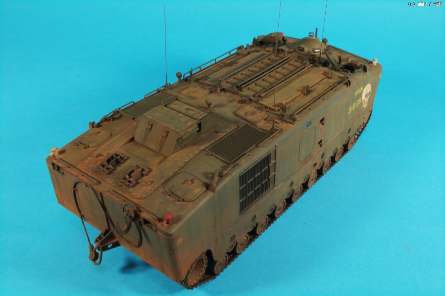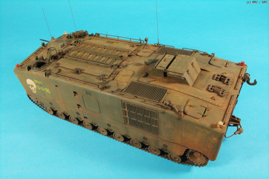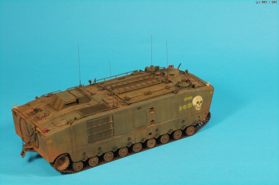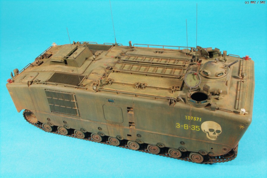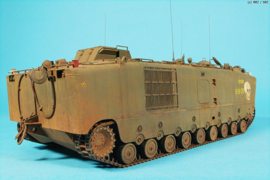 자료에 충실하려면 차체 위에 병력도 태우고, 모래주머니도 잔득 올려야 하지만,아시다시피 월남 미해병 구하기도 어렵고, 모래주머니도 만들기 쉽지 않고,하비팬 별매도 구하기 어려워 작전 끝나고 돌아온 차량의 재현이라 위안하고 있죠.^^
