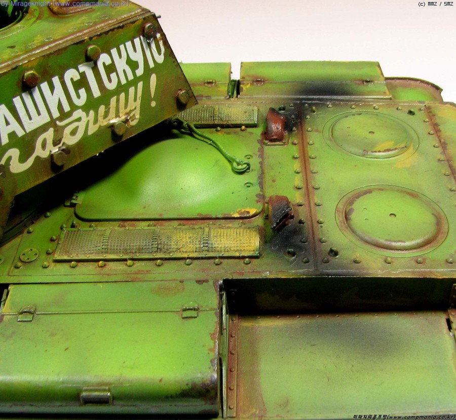 포탑과 차체에 듬성듬성 두툼한 증가장갑과 그를 고정하기 위한 커다란 볼트가 붙은게.. 기계적인 매력이 물씬 풍깁니다. 군제락카 135번 러시아 그린으로 칠하고 유화물감과 에나멜로 처리..