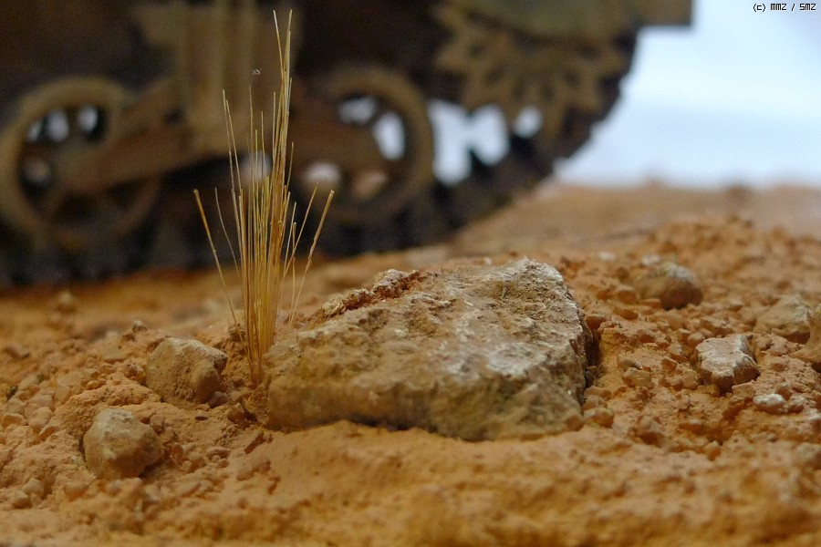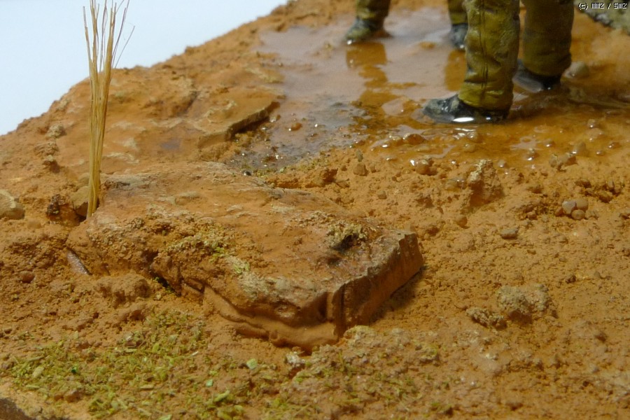 돌은 석고로 rock mold에 부어 만든 것을 사용했습니다. 이후에 아크릴 물감을 에어브러싱하고, 유화물감을 신너와 희석해서 필터링 --> 드라이브러싱으로 표면처리를 했습니다. 예전에는 아크릴로 칠을 한번 하고 말았는데 필터링과 드라이브러싱을 하니 좀더 입체감이 나와 좋은 것 같습니다.마른 풀 한포기를 같이 표현했습니다.