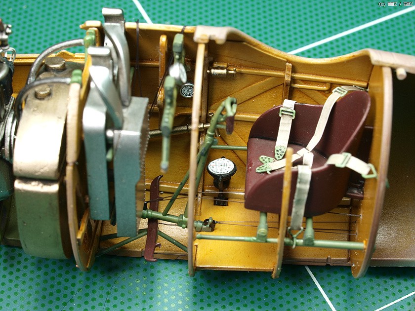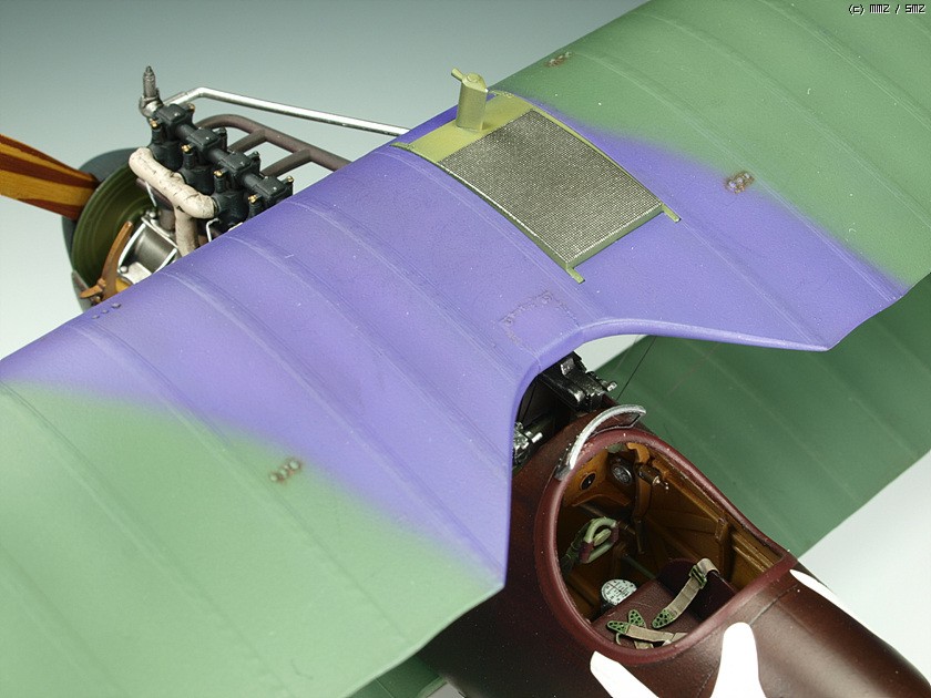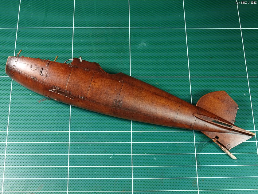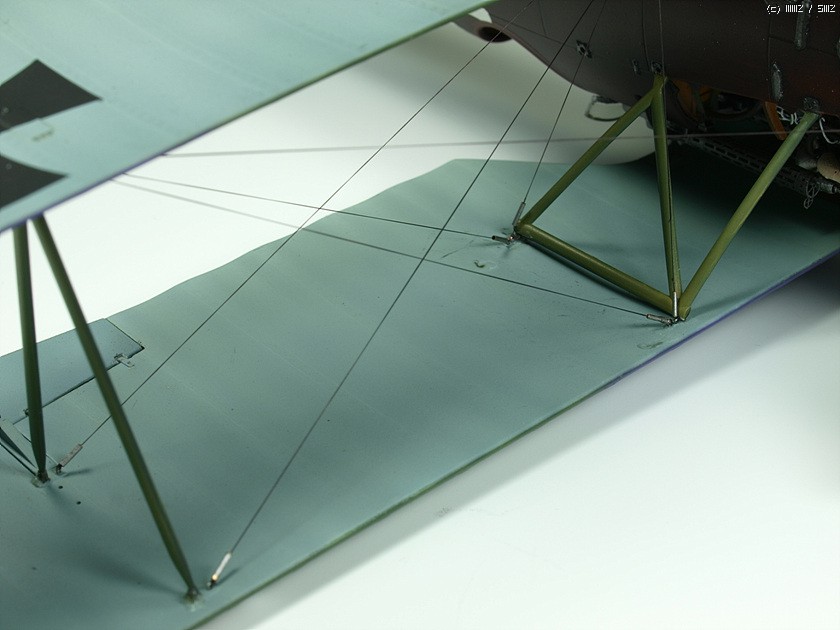제작하게 된 기체는 지정색대로라면 동체 전체가 검정색인데 흰 에델바이스와 대비는 확실하겠지만 복엽기를 스텔스로 만들기는 싫어서 바탕을 짙은 나무색으로 표현하고 검정색으로 워싱하여 나무색이 올라오도록 하였습니다. 리깅은 실기를 참조하여 에나멜선과 황동봉으로 턴버클과 체결고리을 만들고 여기에 라인을 고정시키는 식으로 작업하였습니다.