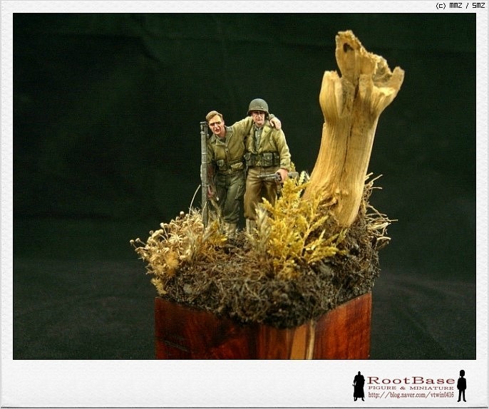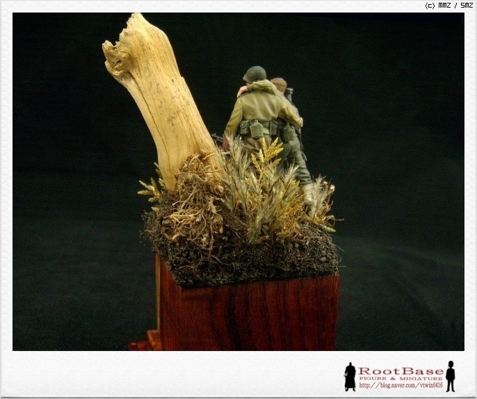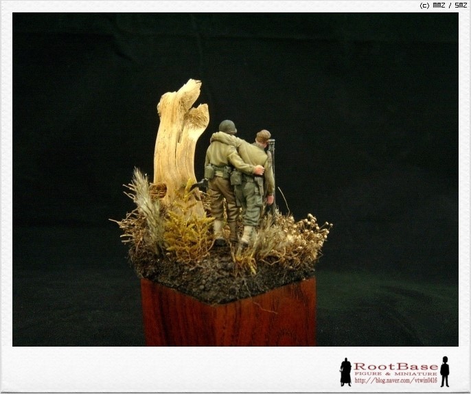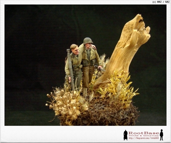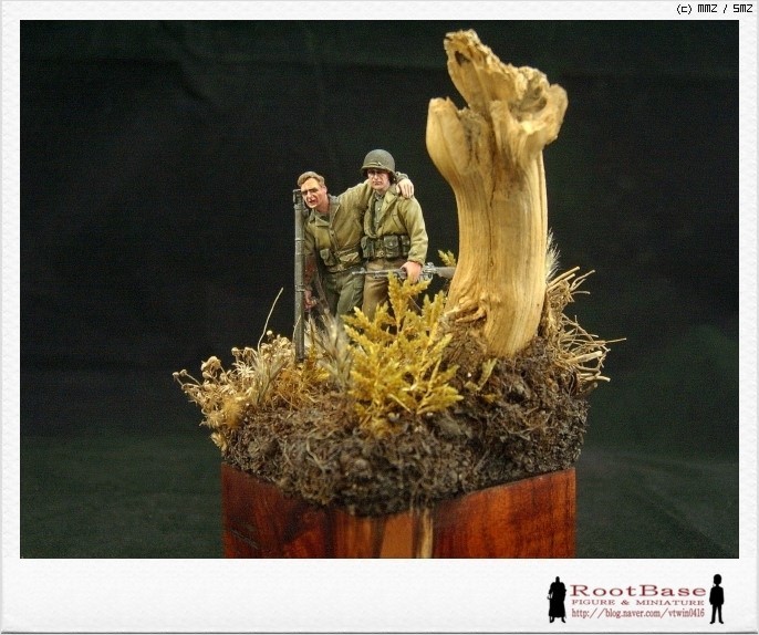 베이스 색상은 두 인형의 점버가 둘다 카키색으로 밝고, 고목도 색상이 밝은터라 처음엔 밝은 톤의 베이스에 올려보았습니다