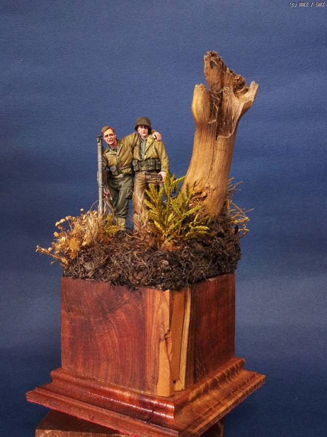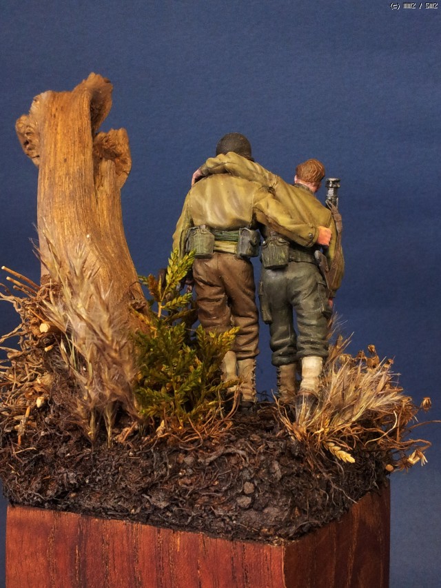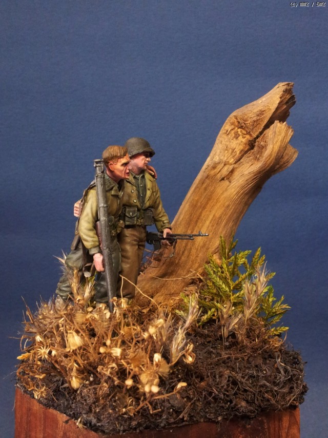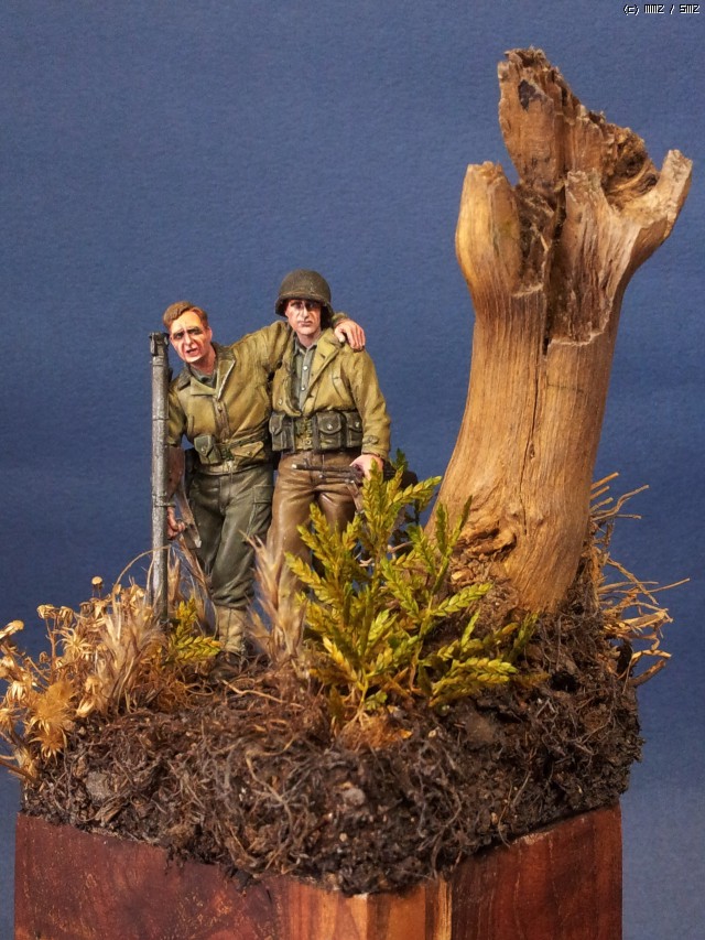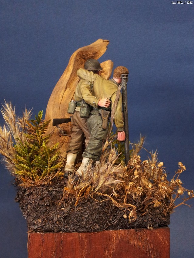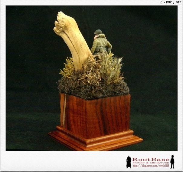 오른편 뒷쪽에 ,오랜 전 포탄에 터져 죽어 버린 고목을 비스듬이 배치하였습니다. 나무도 힘들게 자랐던가 봅니다 ..