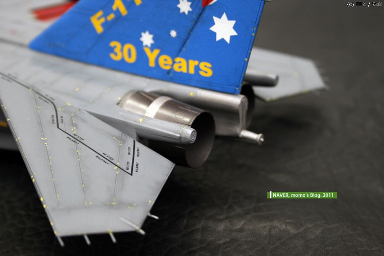 엔진 노즐의 끝 부분은 킷트 자체가 샤프한 맛이 없어서, 반원형 줄로 갈고 칼로 긁어내고, 사포질하면서 얇게 해서 샤프한 느낌을 느껴지게 노력했습니다.