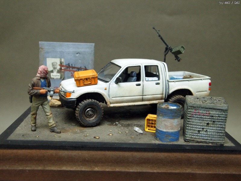 베이스에 추가 한 것은 반쯤 태운 종이와 비닐 잘라 만든 유리가루, 황동봉 잘라서 뿌려 놓은 탄피, 구할수 없어 투명프라봉을 갈아만든 수제 생수병, 헤스코 방벽, 재인님께서 하사하여 주신 생수박스, 키트에 들어있던 물통, 드루시카 탄통 그리고 1/32사이즈 크레이트(음료수 병꼽개-죄송합니다, 한국어로 뭐라고 부르는지 모릅니다.), 자작한 방벽 그리고 예전에 공항에서 얻어온 아랍신문에서 오린 신문기사 사진 등등 입니다.