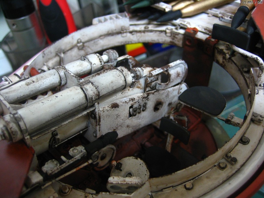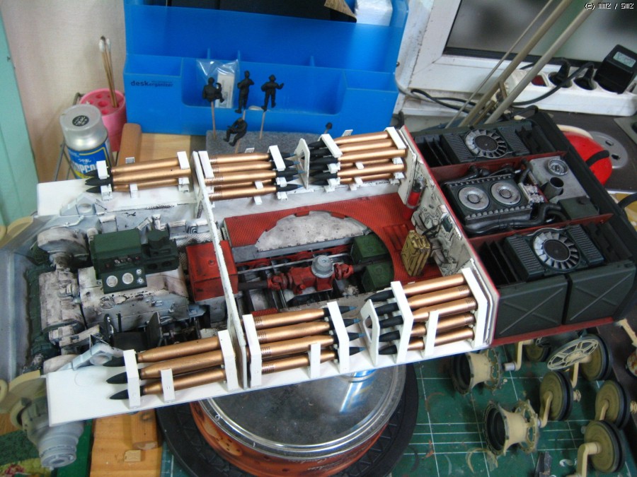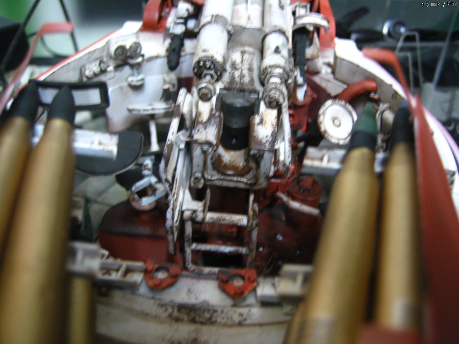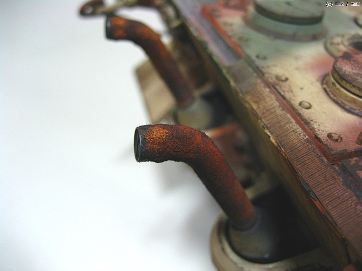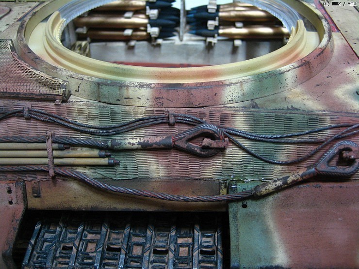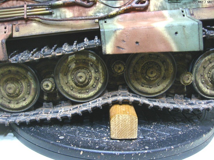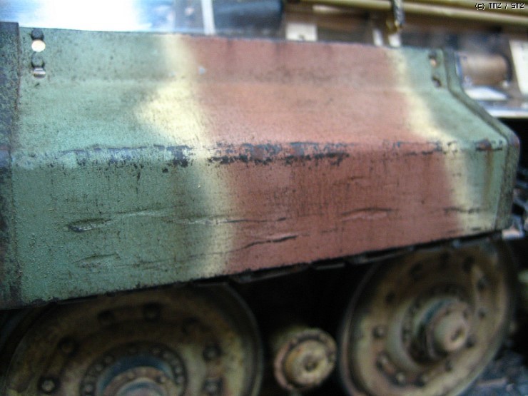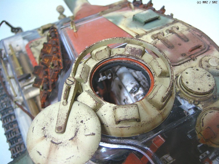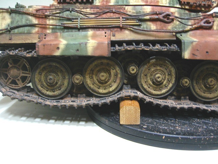 덮어버리니 아쉽네요,, 궤도는 가동식으로 제작을 했고 현수장치는 모두 작동을 하는데 트랙이 받춰 주질못하니,,,어차피 모형이라 굴리고 다닐일은 없을것으로 봅니다 솔직히 완전한 완성작이라 하기에는 한가지가 빠져있습니다 전차장을 올리질 않아서 후에 마무리되면 전차장만 따로 올리겠습니다 인형도색은 볼것도 없지만요,, 도색은 험브럴이고 유화 워싱에 피그먼트 는 미그제품이고 찌메릿 코팅은 에폭시 퍼티로 작업했습니다,,, 감사합니다,,