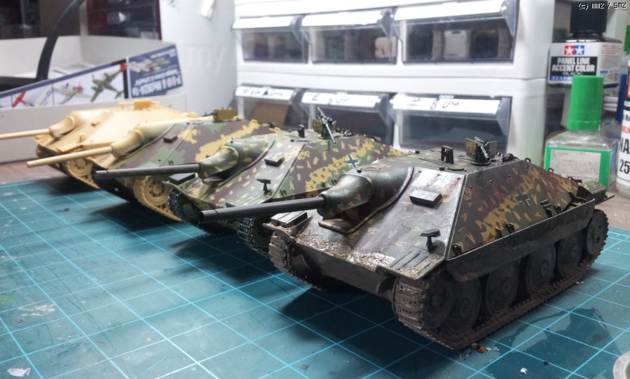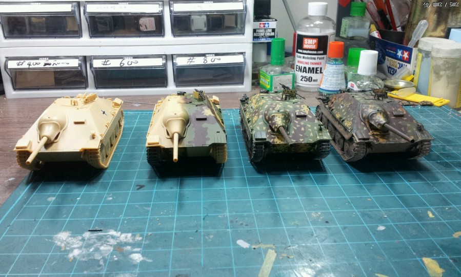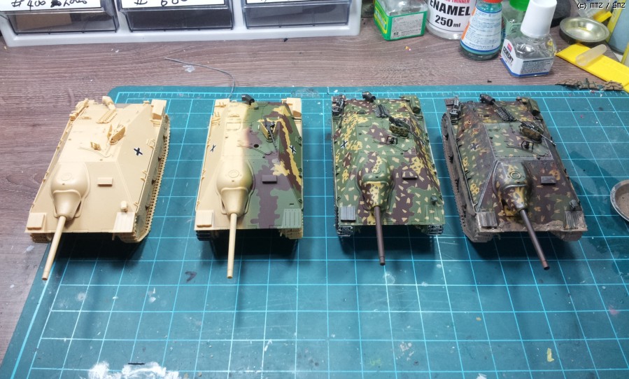 군제락카 레드브라운->마스킹->샌드옐로우->마스킹->다크 그린 순으로 작업하였구요.