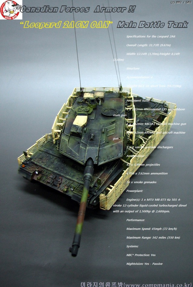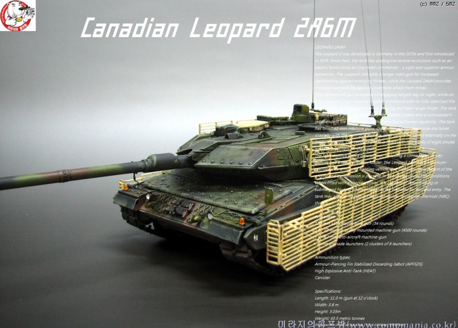 캐나다군은 최신의 레오파트2A6타입을 주력전차로 도입합니다. 도입하면서 창살형 장갑과 자국전용 무전기 그리고 차체 하부와 전반에 증가장갑을 장착한 타입으로 이는 캐나다군만이 도입한 독특한 형태의 레오파트 씨리즈중 하나 입니다. 이와 비슷한 타입으로는 최신의 A7형이 있죠