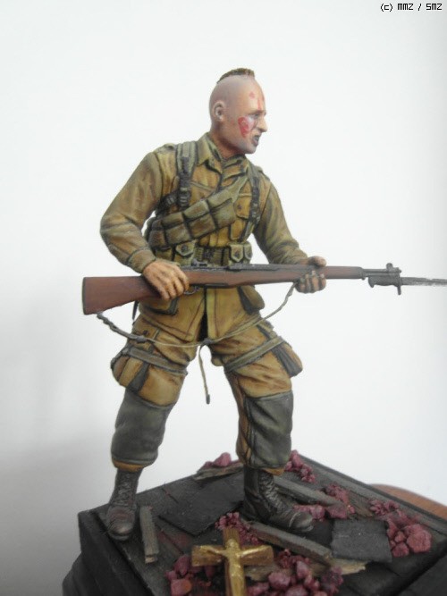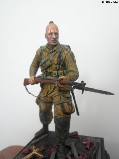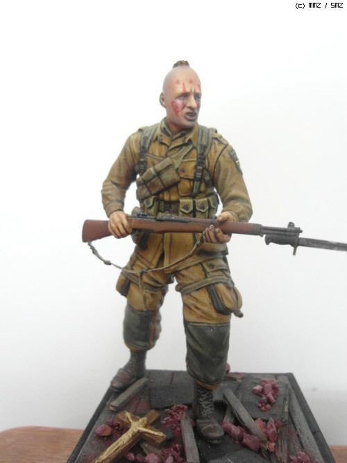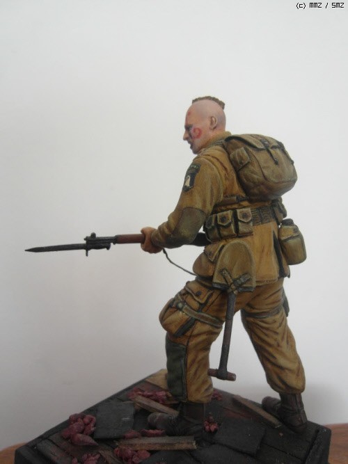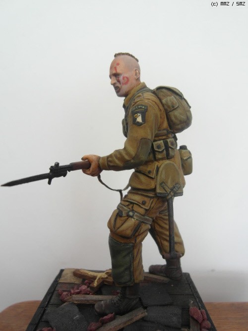 철모를 씌어 주려고 했는데 지쳐서 자작이고 찾는거고 포기..그냥 모히칸 머리를 에폭시 퍼티로 강조해 주고, 페이스 페이팅은 제품 상자 참조하여 그려 줬습니다.왠지 강렬한 맛이 있어서 장식성은 더 좋군요. 얼굴을 최대한 깨끗하게 칠하려고 노력해 봤습니다..101공수사단이 그 당시에 그렇게 역전의 노장은 아니었던 걸로 기억해서요..사자굴에 뛰어든 애송이 같은 느낌이라까..어느정도는 의도대로 나온것 같습니다.