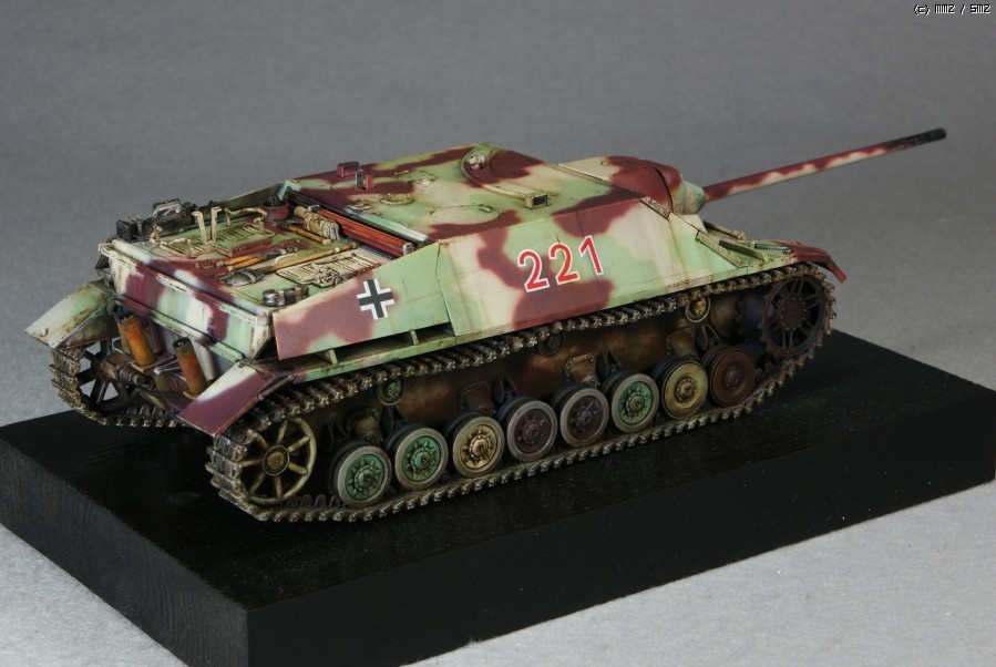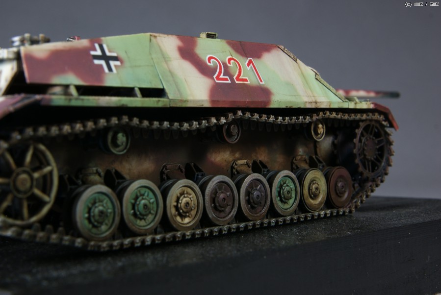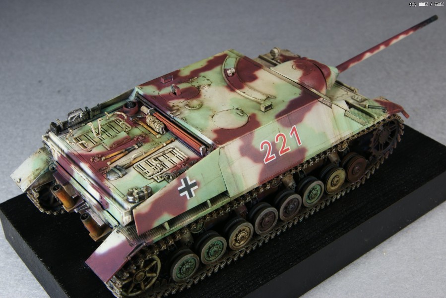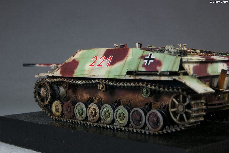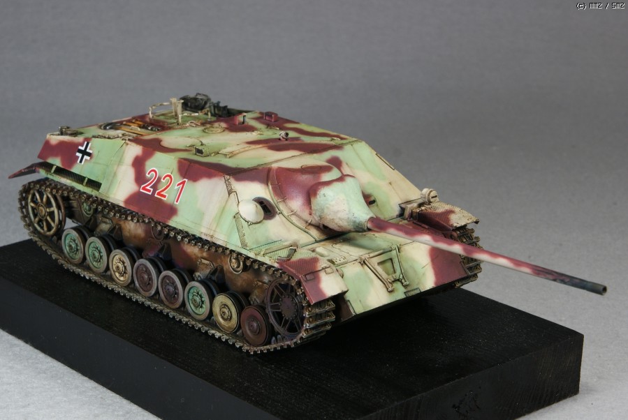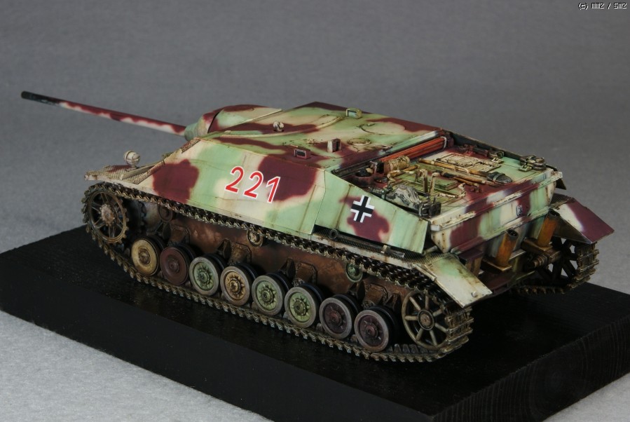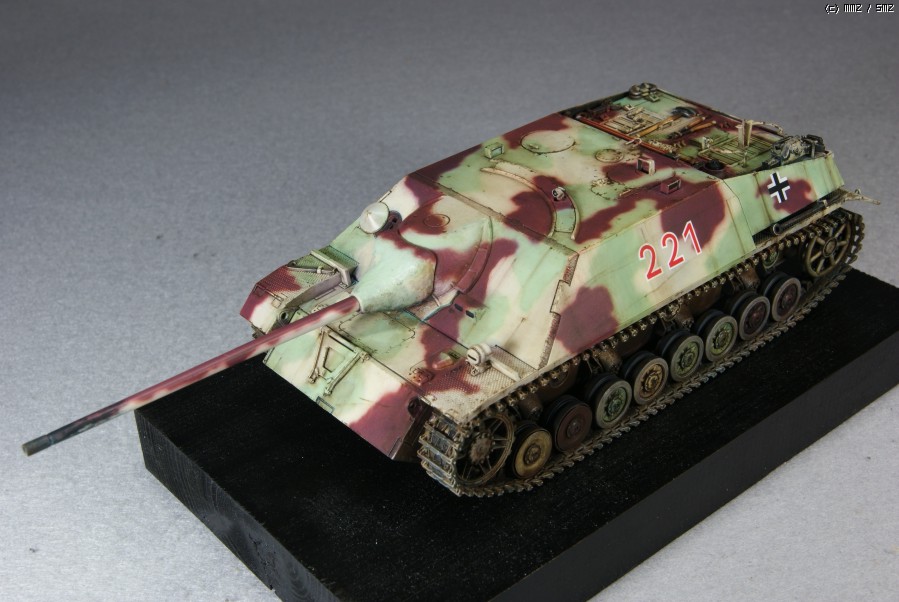 안녕하세요. Dragon 사에서 발매한 1/35 Jagdpanzer IV L/70 구판 키트를 만들었습니다. 이 회사 제품치곤 의외로 제작자의 편의를 생각한 설계가 군데군데 숨어 있어 만들기가 즐거웠습니다. 앞 쪽 흙받이를 약간 가공해서 운용 중 파손 된 흔적을 표현하려고 했고, 흙받이 접철부의 연결 핀이 상당히 두껍게 표현 되어 있어서, 새로 만들어 넣은 것 이외에는 키트 부품으로만 만들었습니다. 재밌게 봐 주시면 감사하겠습니다.